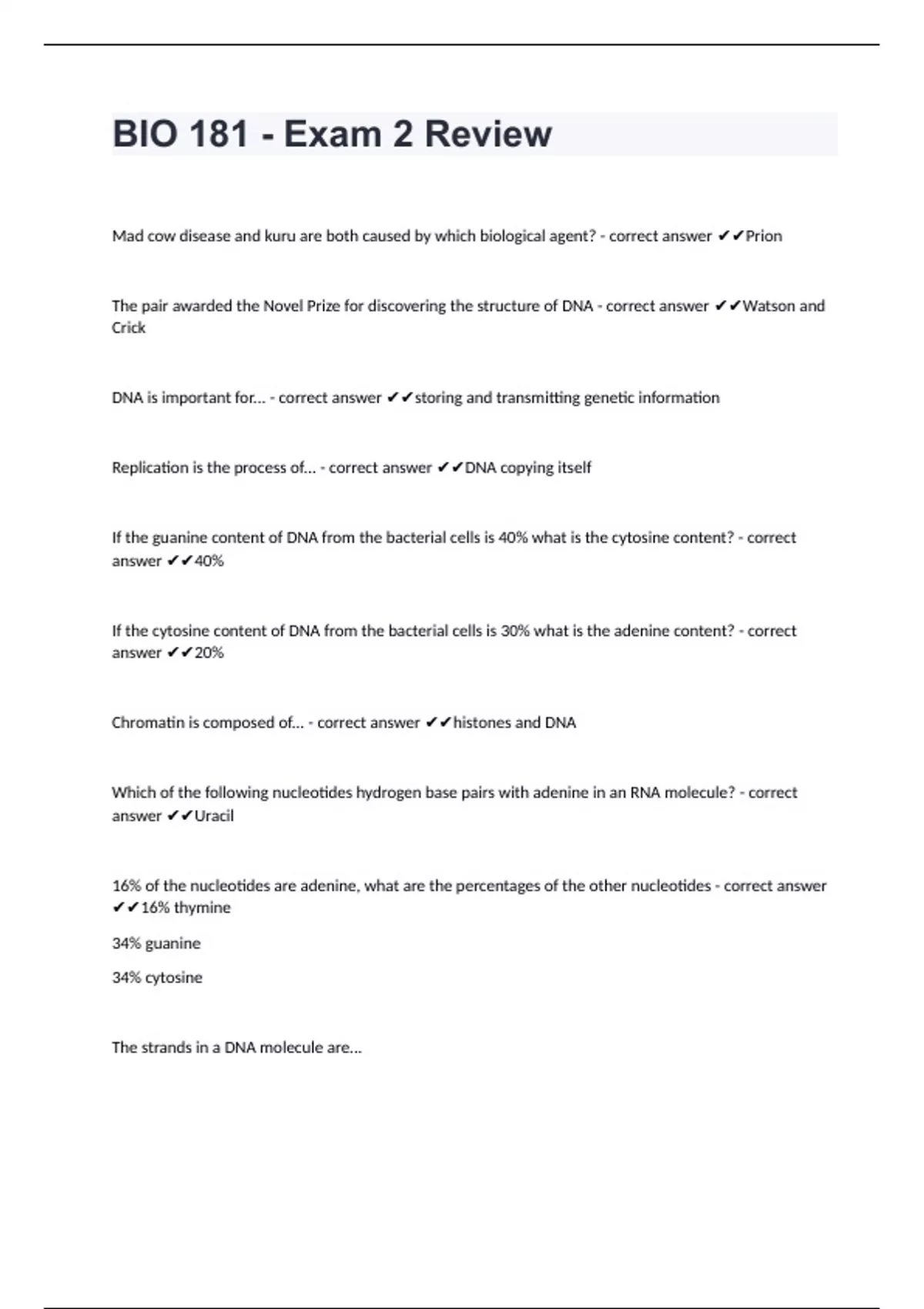 BIO 181 - Exam 2 ReviewMad cow disease and kuru are both caused by which biological agent? - correct answer Prion The pair awarded the Novel Prize for discovering the structure of DNA - correct answer Watson and Crick DNA is important for... - correct answer storing and transmitting genetic information Replication is the process of... - correct answer DNA copying itself If the guanine content of DNA from the bacterial cells is 40% what is the cytosine content? - correct answer 40% If the cytosine content of DNA from the bacterial cells is 30% what is the adenine content? - correct answer 20% Chromatin is composed of... - correct answer histones and DNA Which of the following nucleotides hydrogen base pairs with adenine in an RNA molecule? - correct answer Uracil 16% of the nucleotides are adenine, what are the percentages of the other nucleotides - correct answer 16% thymine 34% guanine 34% cytosine The strands in a DNA molecule are...