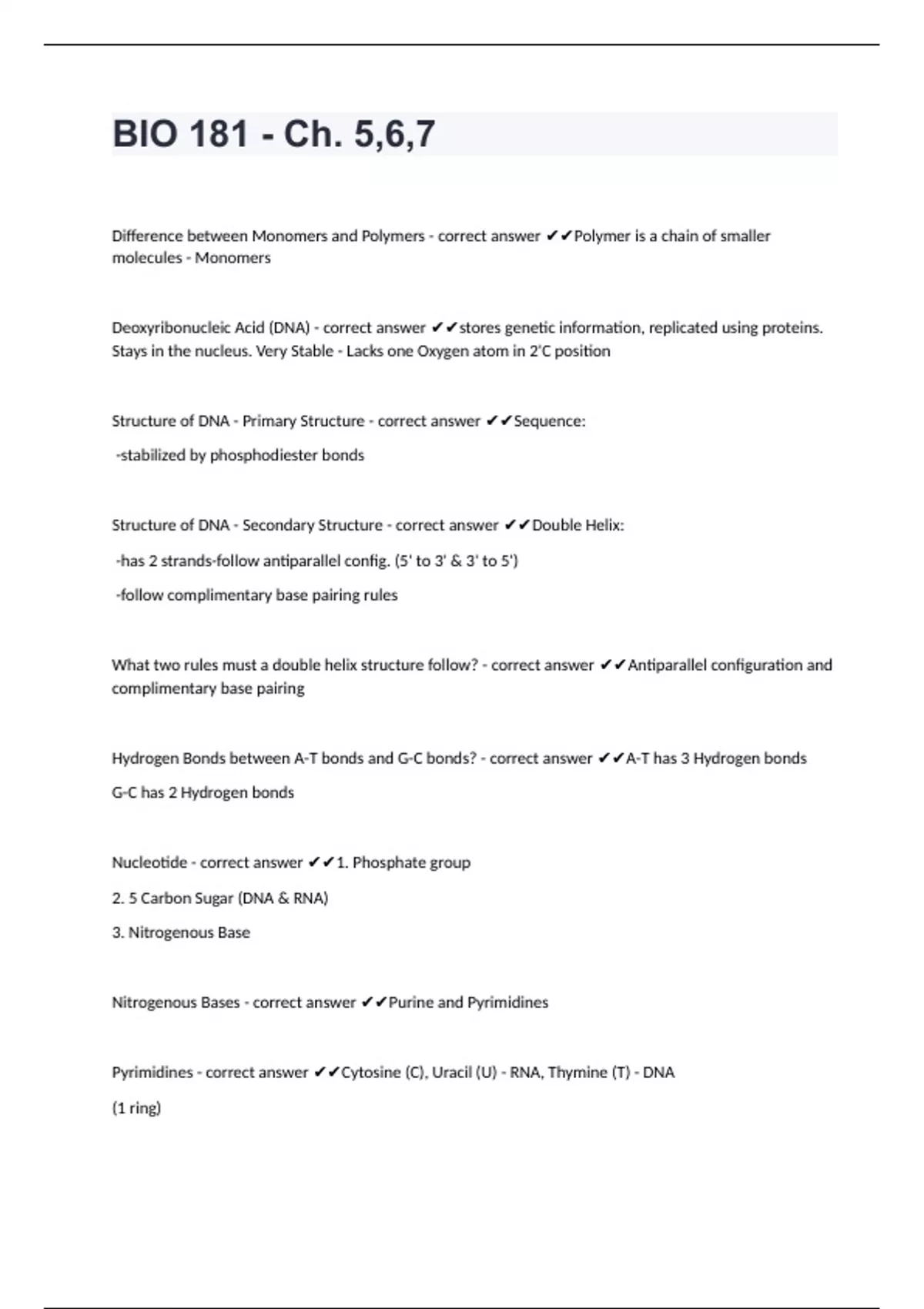 BIO 181 - Ch. 5,6,7Difference between Monomers and Polymers - correct answer Polymer is a chain of smaller molecules - Monomers Deoxyribonucleic Acid (DNA) - correct answer stores genetic information, replicated using proteins. Stays in the nucleus. Very Stable - Lacks one Oxygen atom in 2'C position Structure of DNA - Primary Structure - correct answer Sequence: -stabilized by phosphodiester bonds Structure of DNA - Secondary Structure - correct answer Double Helix: -has 2 strands-follow antiparallel config. (5' to 3' & 3' to 5') -follow complimentary base pairing rules What two rules must a double helix structure follow? - correct answer Antiparallel configuration and complimentary base pairing Hydrogen Bonds between A-T bonds and G-C bonds? - correct answer A-T has 3 Hydrogen bonds G-C has 2 Hydrogen bonds Nucleotide - correct answer 1. Phosphate group 2. 5 Carbon Sugar (DNA & RNA) 3. Nitrogenous Base Nitrogenous Bases - correct answer Purine and Pyrimidines