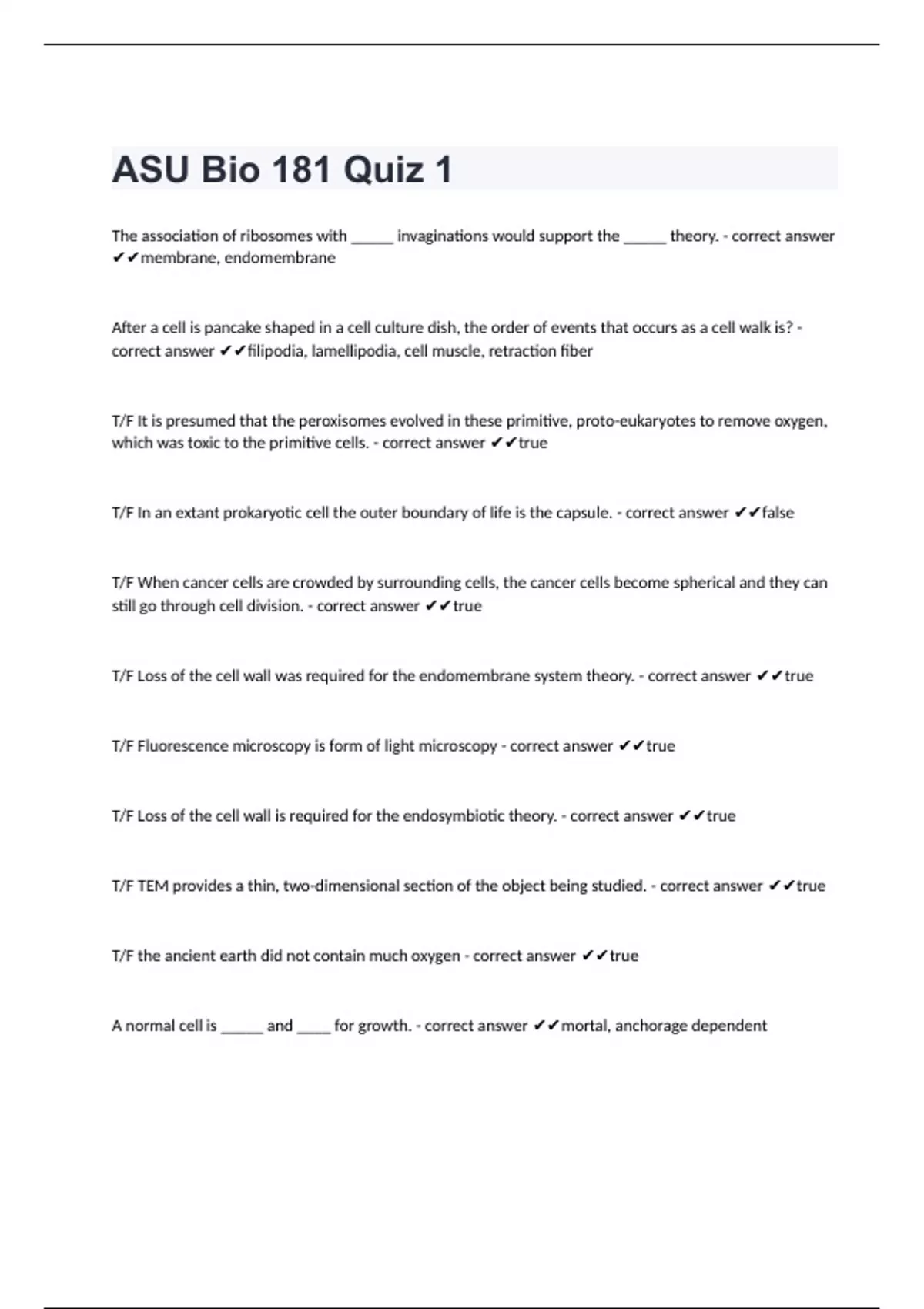 ASU Bio 181 Quiz 1 The association of ribosomes with _____ invaginations would support the _____ theory. - correct answer membrane, endomembrane After a cell is pancake shaped in a cell culture dish, the order of events that occurs as a cell walk is? - correct answer filipodia, lamellipodia, cell muscle, retraction fiber T/F It is presumed that the peroxisomes evolved in these primitive, proto-eukaryotes to remove oxygen, which was toxic to the primitive cells. - correct answer true T/F In an extant prokaryotic cell the outer boundary of life is the capsule. - correct answer false T/F When cancer cells are crowded by surrounding cells, the cancer cells become spherical and they can still go through cell division. - correct answer true T/F Loss of the cell wall was required for the endomembrane system theory. - correct answer true T/F Fluorescence microscopy is form of light microscopy - correct answer true T/F Loss of the cell wall is required for the endosymbiotic theory. - correct answer true T/F TEM provides a thin, two-dimensional section of the object being studied. - correct answer true T/F the ancient earth did not contain much oxygen - correct answer true A normal cell is _____ and ____ for growth. - correct answer mortal, anchorage dependent