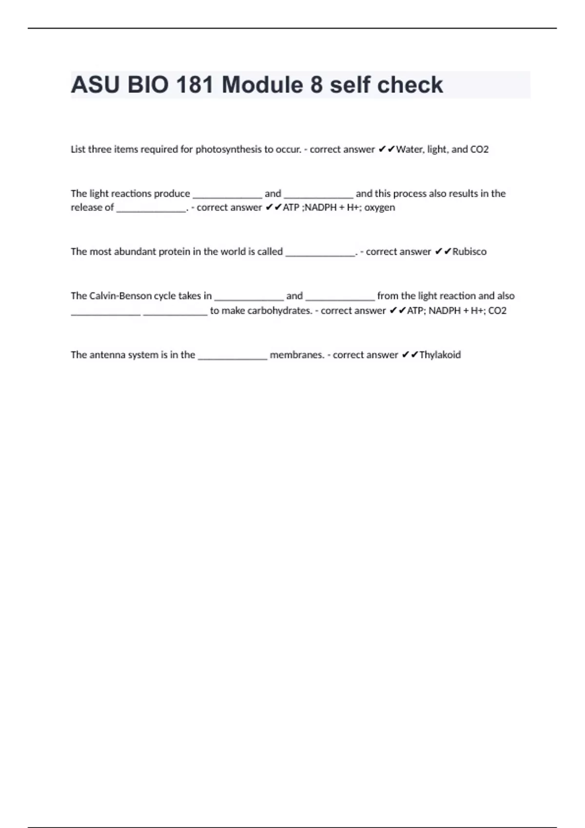 List three items required for photosynthesis to occur. - correct answer ✔✔Water, light, and CO2