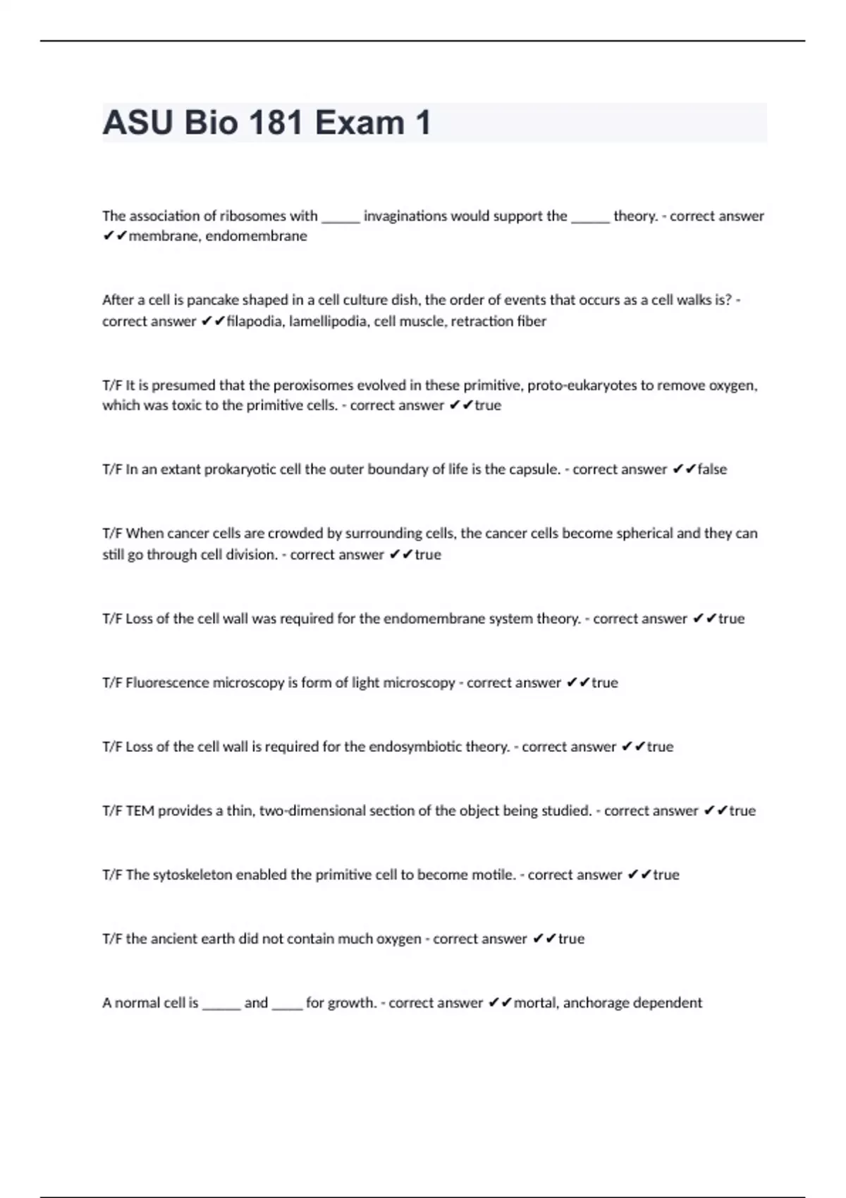 A normal cell is _____ and ____ for growth. - correct answer ✔✔mortal, anchorage dependent T/F Ribosomes bound to some of the membrane invaginations in the endomembrane theory - correct answer ✔✔true