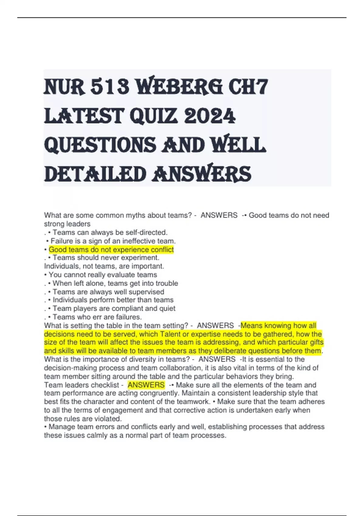 Team leaders checklist - ANSWERS -• Make sure all the elements of the team and