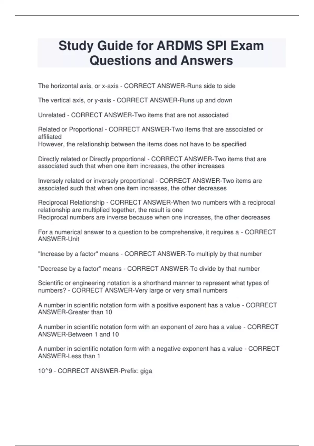 Study Guide for ARDMS SPI Exam Questions and Answers The horizontal axis, or x-axis - CORRECT ANSWER-Runs side to side The vertical axis, or y-axis - CORRECT ANSWER-Runs up and down Unrelated - CORRECT ANSWER-Two items that are not associated Related or Proportional - CORRECT ANSWER-Two items that are associated or affiliated However, the relationship between the items does not have to be specified Directly related or Directly proportional - CORRECT ANSWER-Two items that are associated such that when one item increases, the other increases Inversely related or inversely proportional - CORRECT ANSWER-Two items are associated such that when one item increases, the other decreases Reciprocal Relationship - CORRECT ANSWER-When two numbers with a reciprocal relationship are multiplied together, the result is one Reciprocal numbers are inverse because when one increases, the other decreases For a numerical answer to a question to be comprehensive, it requires a - CORRECT ANSWER-Unit "Increase by a factor" means - CORRECT ANSWER-To multiply by that number "Decrease by a factor" means - CORRECT ANSWER-To divide by that number Scientific or engineering notation is a shorthand manner to represent what types of numbers? - CORRECT ANSWER-Very large or very small numbers A number in scientific notation form with a positive exponent has a value - CORRECT ANSWER-Greater than 10 A number in scientific notation form with an exponent of zero has a value - CORRECT ANSWER-Between 1 and 10 A number in scientific notation form with a negative exponent has a value - CORRECT ANSWER-Less than 1 10⌃9 - CORRECT ANSWER-Prefix: giga Symbol: G Meaning: billion 10⌃6 - CORRECT ANSWER-Prefix: mega Symbol: M Meaning: million 10⌃3 - CORRECT ANSWER-Prefix: kilo Symbol: k Meaning: thousand 10⌃2 - CORRECT ANSWER-Prefix: hect