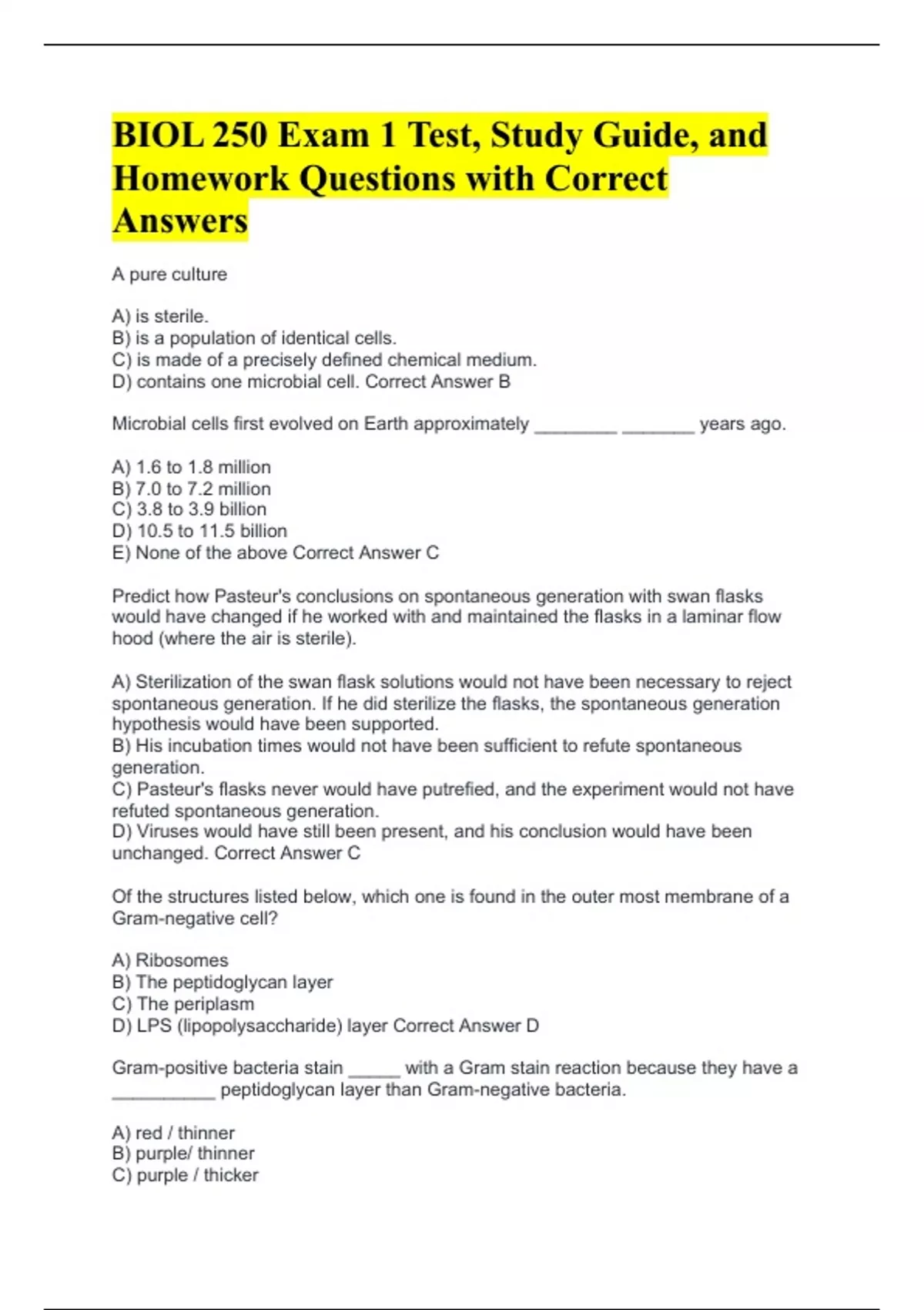 BIOL 250 Exam 1 Test, Study Guide, and Homework Questions with Correct Answers