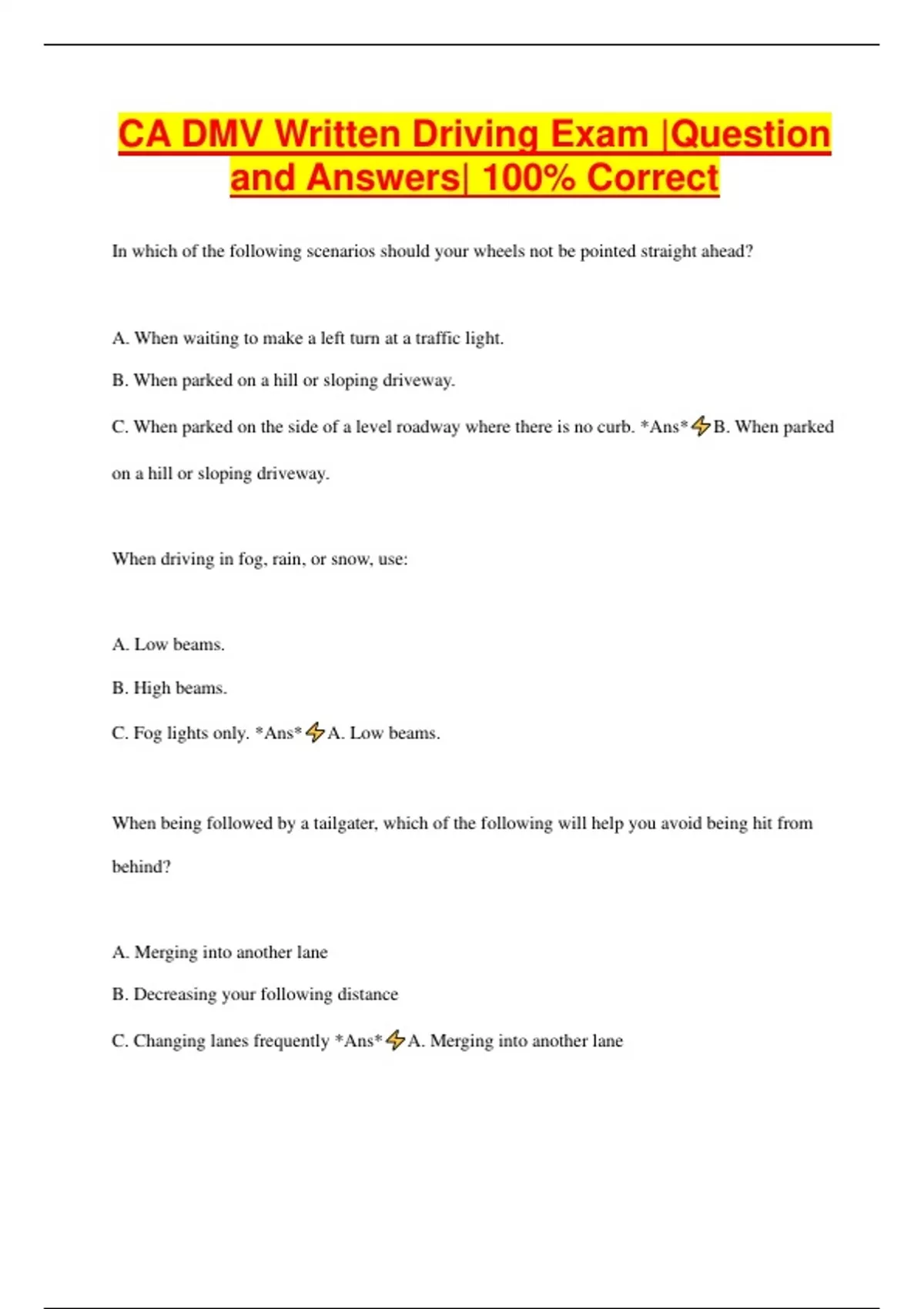 CA DMV Written Driving Exam |Question and Answers| 100% Correct In which of the following scenarios should your wheels not be pointed straight ahead? A. When waiting to make a left turn at a traffic light. B. When parked on a hill or sloping driveway. C. When parked on the side of a level roadway where there is no curb. *Ans* B. When parked on a hill or sloping driveway. When driving in fog, rain, or snow, use: A. Low beams. B. High beams. C. Fog lights only. *Ans* A. Low beams. When being followed by a tailgater, which of the following will help you avoid being hit from behind? A. Merging into another lane B. Decreasing your following distance C. Changing lanes frequently *Ans* A. Merging into another lane A broken yellow centerline means that: A. Passing is not permitted. B. Passing on the right is permitted when the way ahead is clear. C. Passing on the left is permitted when the way ahead is clear. *Ans* C. Passing on the left is permitted when the way ahead is clear. If you approach a traffic light with a red signal and a police officer directs you to go through the intersection without stopping, you should: A. Stop until the light turns green. B. Go through the intersection without stopping. C. Come to a complete stop before proceeding. *Ans* B. Go through the intersection without stopping. An orange and red triangular sign on a vehicle always means: A. The vehicle has the right-of-way. B. Slow-moving vehicle. C. Shoulder work ahead. *Ans* B. Slow-moving vehicle. A person may legally ride in the back of a pickup truck when: A. The sides of the pickup bed are at least 24 inches high. B. The back of the pickup is covered with a camper shell. C. In a secured seat and while using an approved safety belt. *Ans* C. In a secured seat and while using an approved safety belt. There are two traffic lanes moving in your direction. You are driving in the left lane and many vehicles are passing you on the right. If the driver behind you wishes to drive faster, you should: A. Stay in your lane so you don't impede the flow of traffic. B. Drive onto the left shoulder to let the other vehicles pass. C. Move into the right lane when it is safe. *Ans* C. Move into the right lane when it is safe. If you park facing uphill on a street with a curb