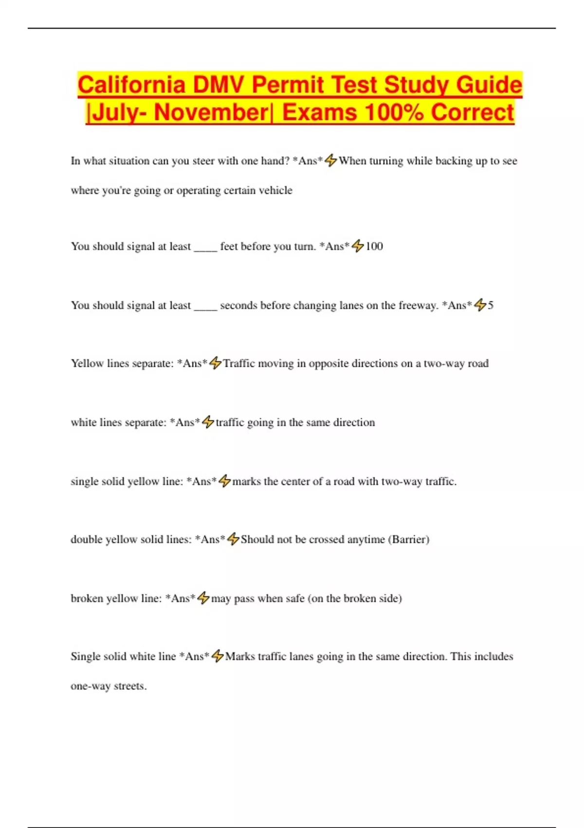 California DMV Permit Test Study Guide |July- November| Exams 100% Correct In what situation can you steer with one hand? *Ans* When turning while backing up to see where you're going or operating certain vehicle You should signal at least ____ feet before you turn. *Ans* 100 You should signal at least ____ seconds before changing lanes on the freeway. *Ans* 5 Yellow lines separate: *Ans* Traffic moving in opposite directions on a two-way road white lines separate: *Ans* traffic going in the same direction single solid yellow line: *Ans* marks the center of a road with two-way traffic. double yellow solid lines: *Ans* Should not be crossed anytime (Barrier) broken yellow line: *Ans* may pass when safe (on the broken side) Single solid white line *Ans* Marks traffic lanes going in the same direction. This includes one-way streets. double solid white lines: *Ans* Barrier between regular lane and "preferential" (carpool) lane. Never change lanes over these. Broken white lines: *Ans* Lanes going in the same direction. You can pass/change lanes. yield line: *Ans* is a line of triangles extending across the roadway that may be used with a yield sign to show the point at which you must yield or stop, if necessary. A yield line is often seen at the entrance of a roundabout ending freeway/street lanes marked with: *Ans* large broken lines which lane is the fast lane? *Ans* the left lane (number 1) use the left lane to *Ans* pass or turn left Use the right lane to *Ans* enter or exit traffic You may only drive for ___ feet in a center left turn lane. *Ans* 200 You can enter a bike lane to turn within ____ feet of an intersection *Ans* 200 f