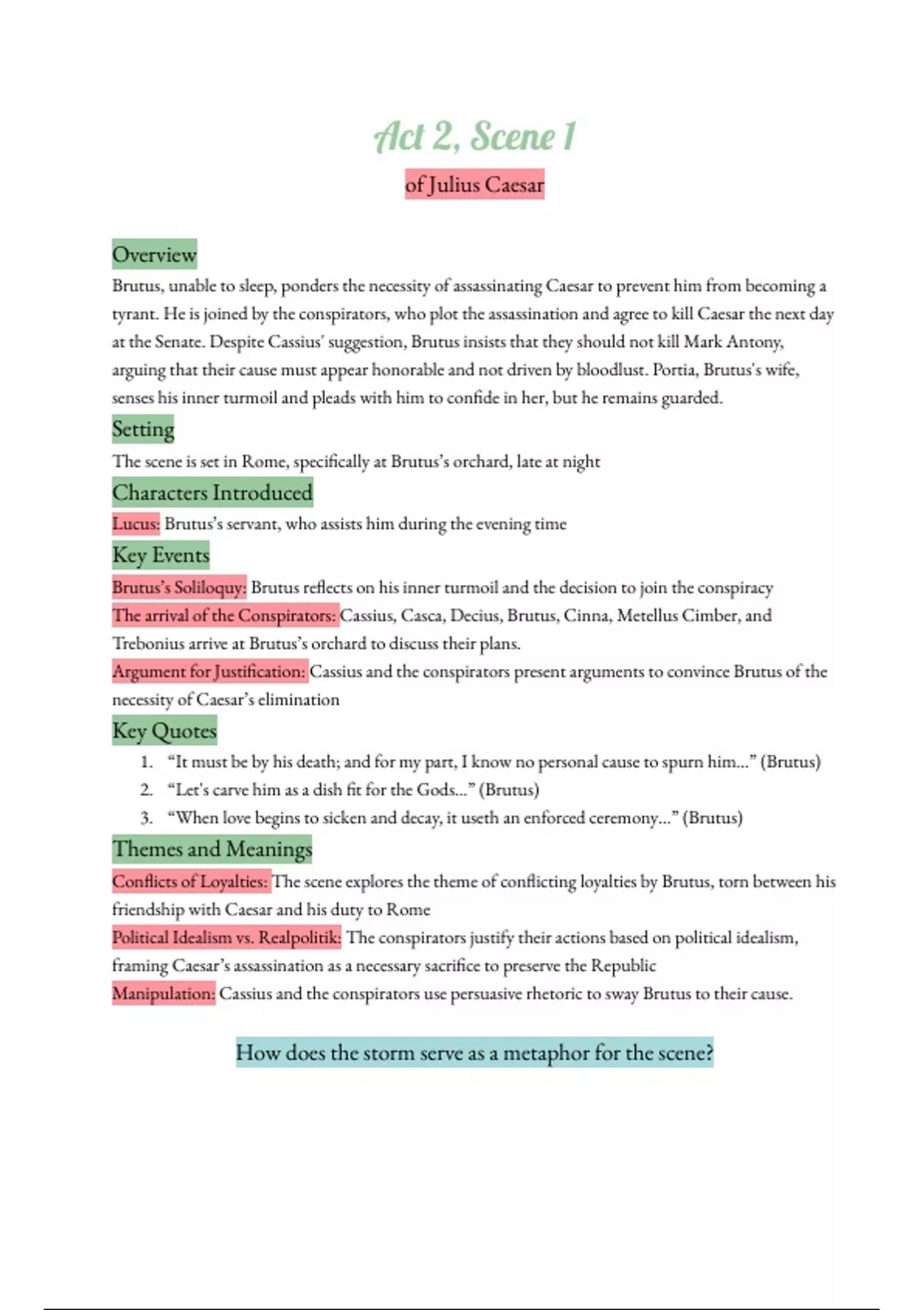 This 1 page of notes gives a brief but detailed look into Shakespeare's "Julius Caesar", Act 2 It gives an overall summary of what happened, along with the setting, characters introduced, key events, symbolism, themes, and meanings. This is perfect for anyone getting into Julius Caesar and want clear and precise information, or anyone who wants to get that last-minute studying in.