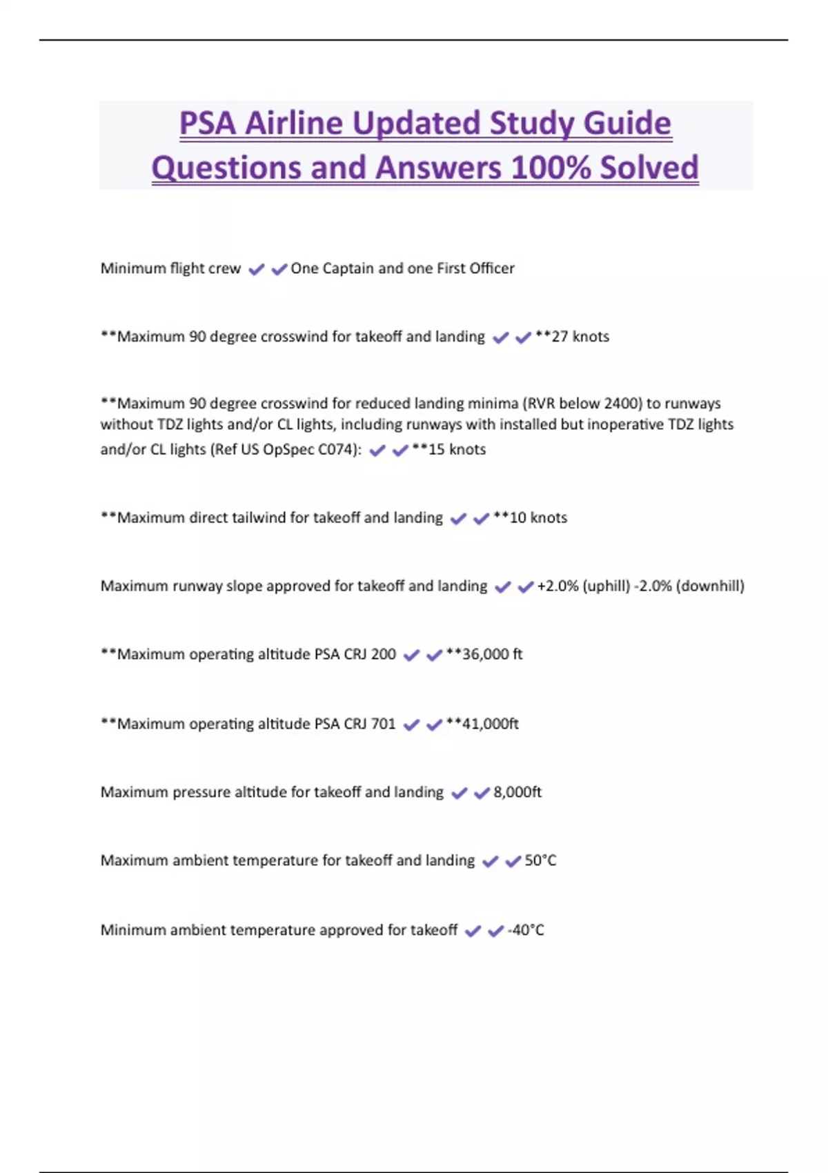 PSA Airline Updated Study Guide Questions and Answers 100% Solved Minimum flight crew One Captain and one First Officer **Maximum 90 degree crosswind for takeoff and landing **27 knots **Maximum 90 degree crosswind for reduced landing minima (RVR below 2400) to runways without TDZ lights and/or CL lights, including runways with installed but inoperative TDZ lights and/or CL lights (Ref US OpSpec C074): **15 knots **Maximum direct tailwind for takeoff and landing **10 knots Maximum runway slope approved for takeoff and landing