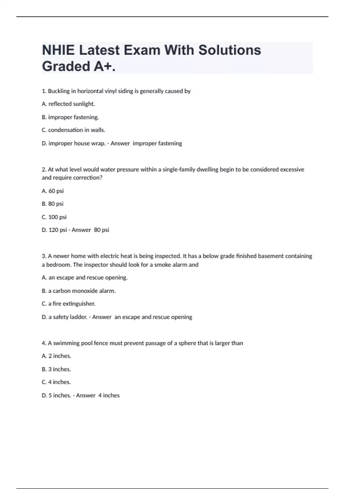 1. Buckling in horizontal vinyl siding is generally caused by A. reflected sunlight. B. improper fastening. C. condensation in walls. D. improper house wrap. - Answer improper fastening 2. At what level would water pressure within a single-family dwelling begin to be considered excessive and require correction? A. 60 psi B. 80 psi C. 100 psi D. 120 psi - Answer 80 psi 3. A newer home with electric heat is being inspected. It has a below grade finished basement containing a bedroom. The inspector should look for a smoke alarm and A. an escape and rescue opening. B. a carbon monoxide alarm. C. a fire extinguisher. D. a safety ladder. - Answer an escape and rescue opening 4. A swimming pool fence must prevent passage of a sphere that is larger than A. 2 inches. B. 3 inches. C. 4 inches. D. 5 inches. - Answer 4 inches