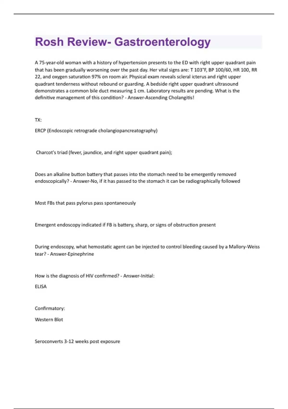 A 75-year-old woman with a history of hypertension presents to the ED with right upper quadrant pain that has been gradually worsening over the past day. Her vital signs are: T 103°F, BP 100/60, HR 100, RR 22, and oxygen saturation 97% on room air. Physical exam reveals scleral icterus and right upper quadrant tenderness without rebound or guarding. A bedside right upper quadrant ultrasound demonstrates a common bile duct measuring 1 cm. Laboratory results are pending. What is the definitive management of this condition? - Answer-Ascending Cholangitis! TX: ERCP (Endoscopic retrograde cholangiopancreatography) Charcot's triad (fever, jaundice, and right upper quadrant pain); Does an alkaline button battery that passes into the stomach need to be emergently removed endoscopically? - Answer-No, if it has passed to the stomach it can be radiographically followed Most FBs that pass pylorus pass spontaneously Emergent endoscopy indicated if FB is battery, sharp, or signs of obstruction present During endoscopy, what hemostatic agent can be injected to control bleeding caused by a Mallory-Weiss tear? - Answer-Epinephrine How is the diagnosis of HIV confirmed? - Answer-Initial: ELISA Confirmatory: Western Blot Seroconverts 3-12 weeks post exposureIf a previously vaccinated hospital worker tests negative for HBsAb and is exposed to a HBsAg positive source, what is the recommended postexposure prophylaxis? - Answer-Hepatitis B immune globulin and hepatitis B vaccine. In a patient with right-sided pelvic pain, what is the imaging modality of choice? - Answer-Pelvic ultrasound with Doppler flow! It is sensitive for many GYN disorders and, in the hands of an experienced technician, compressive ultrasound can diagnose appendicitis. In patients with appendicitis, what physical sign occurs when right lower quadrant pain is elicited by passive right hip extension? - Answer-Psoas Sign! Irritable bowel syndrome is a common example of which subclass of chronic diarrhea? - Answer-Motility disorder, in which stool osmotic gap is normal Is an NG tube required in acute pancreatitis? - Answer-No, it is recommended for patients with intractable vomiting or ileus. Name another common risk factor for gallstones, especially in a patient post abdominal surgery. - Answer-TPN (Total parenteral nutrition) Prevention of polyps, and therefore colon cancer, involves which strategies? - Answer-Maintaining an appropriate weight, a diet high in fiber and low in fat, and tobacco and alcohol cessation. What are complications that can make hepatic encephalopathy worse? - Answer-Constipation, Increasing ammonia levels, renal failure, Gi bleeding, infection, diuretic therapy leading to hypokalemia and alkalosis What are Irremovable white lesions on lateral tongue associated with HIV diagnosis? - Answer-Oral Hairy Leukoplakia!What are longitudinal mucosal lacerations of the distal esophagus usually including the gastroesophageal junction? - Answer-Mallory Weiss Tear!