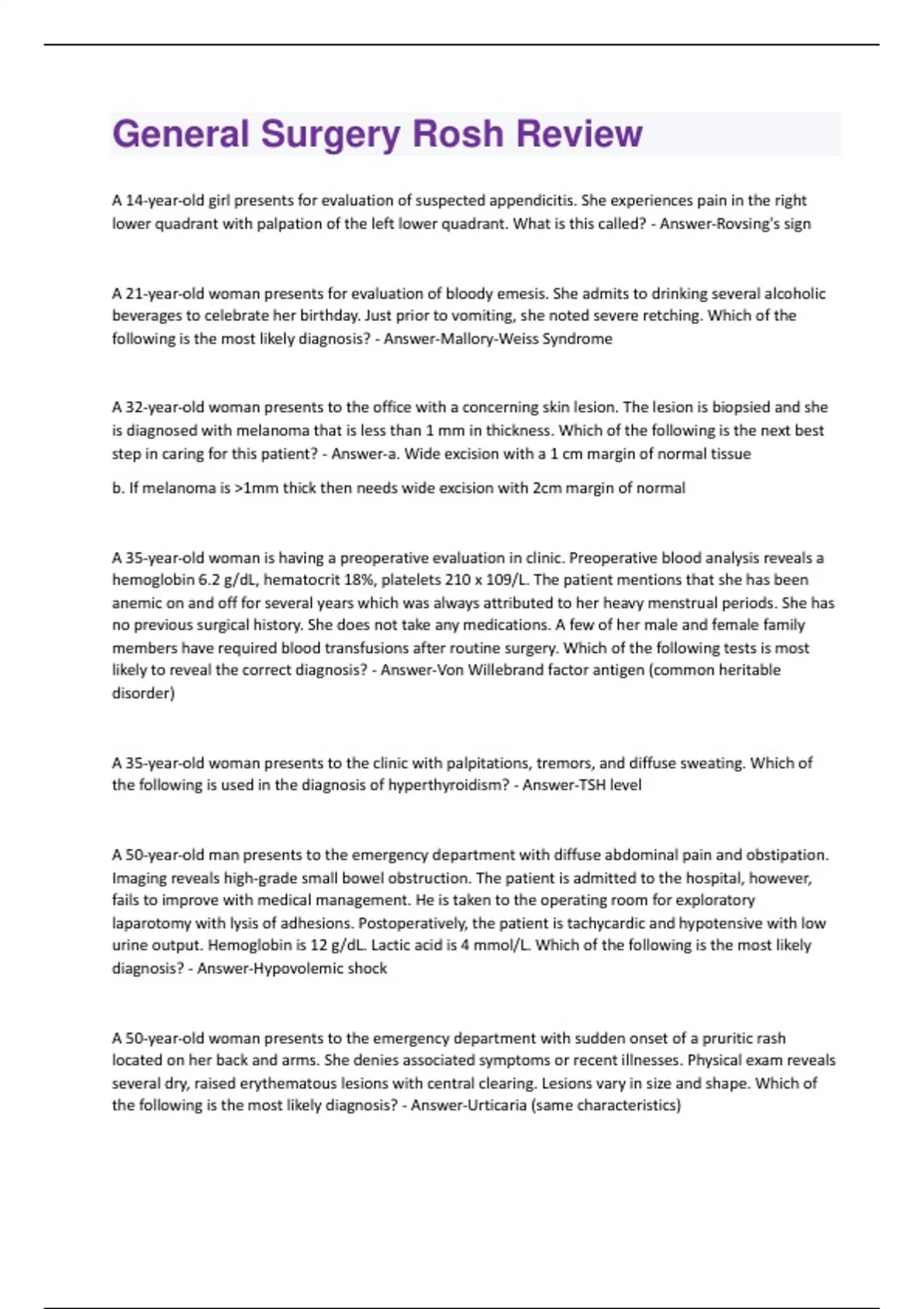 A 14-year-old girl presents for evaluation of suspected appendicitis. She experiences pain in the right lower quadrant with palpation of the left lower quadrant. What is this called? - Answer-Rovsing's sign A 21-year-old woman presents for evaluation of bloody emesis. She admits to drinking several alcoholic beverages to celebrate her birthday. Just prior to vomiting, she noted severe retching. Which of the following is the most likely diagnosis? - Answer-Mallory-Weiss Syndrome A 32-year-old woman presents to the office with a concerning skin lesion. The lesion is biopsied and she is diagnosed with melanoma that is less than 1 mm in thickness. Which of the following is the next best step in caring for this patient? - Answer-a. Wide excision with a 1 cm margin of normal tissue b. If melanoma is >1mm thick then needs wide excision with 2cm margin of normal A 35-year-old woman is having a preoperative evaluation in clinic. Preoperative blood analysis reveals a hemoglobin 6.2 g/dL, hematocrit 18%, platelets 210 x 109/L. The patient mentions that she has been anemic on and off for several years which was always attributed to her heavy menstrual periods. She has no previous surgical history. She does not take any medications. A few of her male and female family members have required blood transfusions after routine surgery. Which of the following tests is most likely to reveal the correct diagnosis? - Answer-Von Willebrand factor antigen (common heritable disorder) A 35-year-old woman presents to the clinic with palpitations, tremors, and diffuse sweating. Which of the following is used in the diagnosis of hyperthyroidism? - Answer-TSH level A 50-year-old man presents to the emergency department with diffuse abdominal pain and obstipation. Imaging reveals high-grade small bowel obstruction. The patient is admitted to the hospital, however, fails to improve with medical management. He is taken to the operating room for exploratory laparotomy with lysis of adhesions. Postoperatively, the patient is tachycardic and hypotensive with low urine output. Hemoglobin is 12 g/dL. Lactic acid is 4 mmol/L. Which of the following is the most likely diagnosis? - Answer-Hypovolemic shock A 50-year-old woman presents to the emergency department with sudden onset of a pruritic rash located on her back and arms. She denies associated symptoms or recent illnesses. Physical exam reveals several dry, raised erythematous lesions with central clearing. Lesions vary in size and shape. Which of the following is the most likely diagnosis? - Answer-Urticaria (same characteristics)A 53-year-old overweight man presents to the outpatient clinic with recurrent burning abdominal pain that occurs two to three hours after a meal. Which of the following would be the most frequent physical examination finding in this patient? - Answer-Epigastric tenderness A 55-year-old with an abdominal mass is diagnosed with a cortisol-secreting adrenocortical carcinoma. He is immediately referred for surgical resection. Which of the following medications is the best choice to be administered immediately after surgery to prevent hypotension? - Answer-Hydrocortisone (prevents sudden drop in serum cortisol levels that causes low BP) A 60-year-old man has been bedridden following a stroke several months ago. Urinalysis shows high levels of protein in the urine and nephrotic syndrome is suspected. On physical exam, where would the provider likely detect edema? - Answer-Sacrum (patient has been bedridden) A 60-year-old man presents to his primary care provider with the complaint of feeling lightheaded and dizzy when he stands. The patient is currently prescribed hydrocortisone and fludrocortisone for treatment of adrenal insufficiency, doxazosin for treatment of urinary symptoms from enlarged prostate, and erythropoietin for anemia due to renal failure. What is the most appropriate treatment to decrease his orthostatic hypotension symptoms? - Answer-Discontinue doxazosin (alpha-adrenergic antagonist can cause orthostatic hypotension) A 64-year-old man presents to the clinic complaining of worsening fatigue over the past six months despite no change in his sleep habits. He denies diet changes and states he has been well-hydrated from all the ice that he eats. Physical exam reveals skin pallor and koilonychia. Which of the following is the most likely diagnosis? - Answer-Iron-deficiency anemia