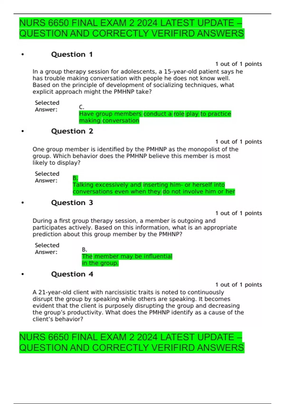 In a group therapy session for adolescents, a 15-year-old patient says he has trouble making conversation with people he does not know well. Based on the principle of development of socializing techniques, what explicit approach might the PMHNP take? Selected Answer: C. Have group members conduct a role play to practice making conversation • Question 2 1 out of 1 points One group member is identified by the PMHNP as the monopolist of the group. Which behavior does the PMHNP believe this member is most likely to display? Selected Answer: B. Talking excessively and inserting him- or herself into conversations even when they do not involve him or her • Question 3 1 out of 1 points During a first group therapy session, a member is outgoing and participates actively. Based on this information, what is an appropriate prediction about this group member by the PMHNP? Selected Answer: B. The member may be influential in the group. • Question 4 1 out of 1 points A 21-year-old client with narcissistic traits is noted to continuously disrupt the group by speaking while others are speaking. It becomes evident that the client is purposely disrupting the group and decreasing the group’s productivity. What does the PMHNP identify as a cause of the client’s behavior? Selected Answer: A. The client has a fear of losing his or her identity. • Question 5 1 out of 1 points Harold Wyman is a 74-year-old man who is trying to mend a relationship with his adult daughter. Based on his intake assessment, the PMHNP believes that the father has depression. The daughter and Harold meet with the PMNHP, and the daughter explains that her father always appears mopey and withdrawn and refuses to do anything about it. When asked, the father reports feeling sad all the time. Which action will the PMNHP employ with Harold using the interpersonal psychotherapy approach throughout the various sessions? Selected Answer: D. All of the above • Question 6 1 out of 1 points A PMHNP is leading a group therapy session for patients with substance abuse problems. After a productive session in which all members participated, the following week was not as productive. In order to help the group members assume responsibility for evaluating the meeting, what is an appropriate comment for the PMHNP to make? Selected Answer: A. “How would you compare today’s meeting with last week’s?” • Question 7 1 out of 1 points During the “mid-group debrief” the clinical supervisor focused on the following areas with the two counselors except: Selected Answer: B. The mistakes that they made in the group and how they can fix them.