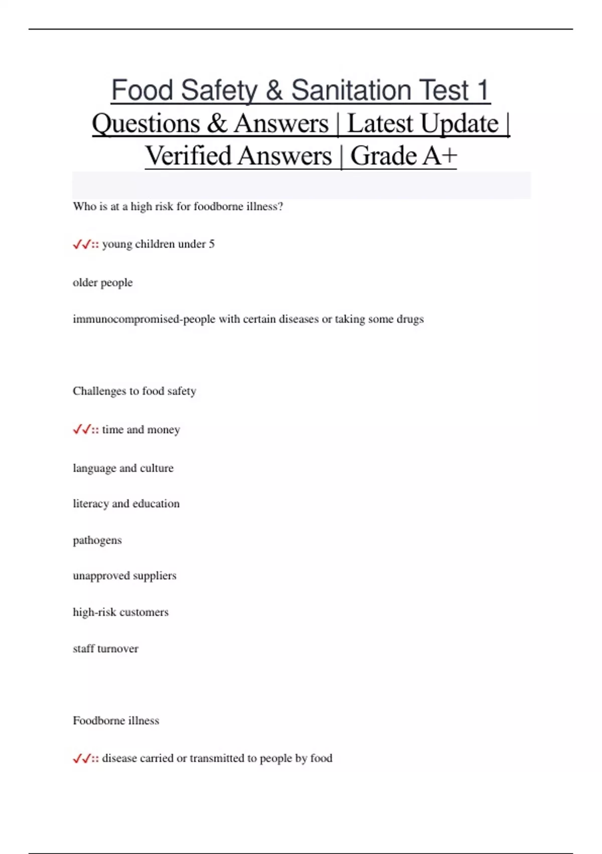 Food Safety & Sanitation Test 1 Questions & Answers | Latest Update | Verified Answers | Grade A+