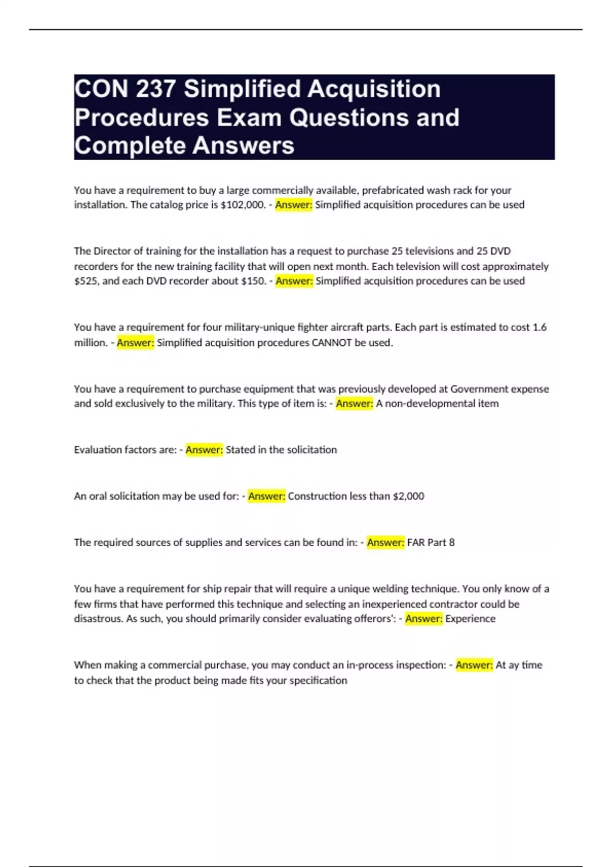 CON 237 Simplified Acquisition Procedures Exam Questions and Complete Answers