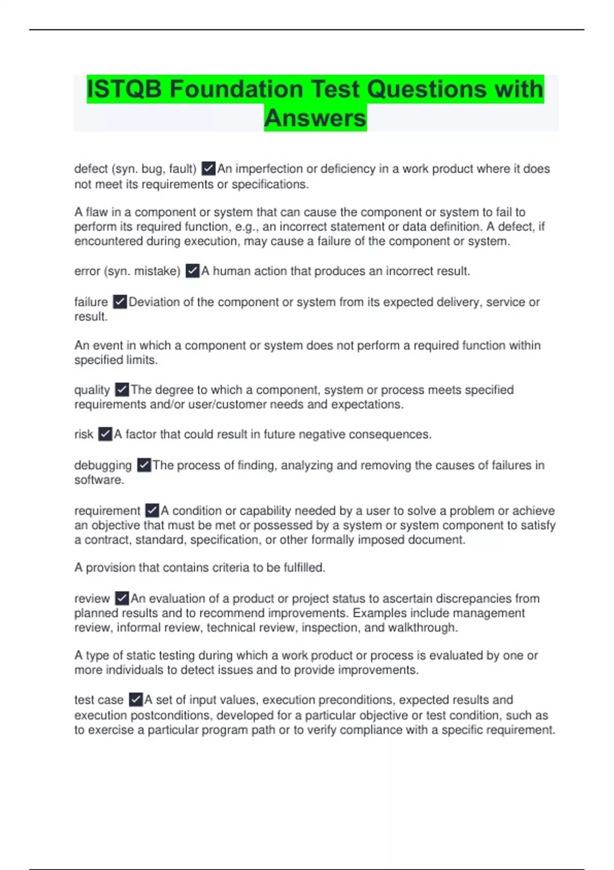defect (syn. bug, fault) An imperfection or deficiency in a work product where it does not meet its requirements or specifications. A flaw in a component or system that can cause the component or system to fail to perform its required function, e.g., an incorrect statement or data definition. A defect, if encountered during execution, may cause a failure of the component or system. error (syn. mistake) A human action that produces an incorrect result. failure Deviation of the component or system from its expected delivery, service or result. An event in which a component or system does not perform a required function within specified limits. quality The degree to which a component, system or process meets specified requirements and/or user/customer needs and expectations. risk A factor that could result in future negative consequences. debugging The process of finding, analyzing and removing the causes of failures in software. requirement A condition or capability needed by a user to solve a problem or achieve an objective that must be met or possessed by a system or system component to satisfy a contract, standard, specification, or other formally imposed document. A provision that contains criteria to be fulfilled. review An evaluation of a product or project status to ascertain discrepancies from planned results and to recommend improvements. Examples include management review, informal review, technical review, inspection, and walkthrough. A type of static testing during which a work product or process is evaluated by one or more individuals to detect issues and to provide improvements. test case A set of input values, execution preconditions, expected results and execution postconditions, developed for a particular objective or test condition, such as to exercise a particular program path or to verify compliance with a specific requirement. A set of preconditions, inputs, actions (where applicable), expected results and postconditions, developed based on test conditions. testing The process consisting of all lifecycle activities, both static and dynamic, concerned with planning, preparation and evaluation of software products and related work products to determine that they satisfy specified requirements, to demonstrate that they are fit for purpose and to detect defects. test objective A reason or purpose for designing and executing a test. confirmation testing (syn. re-testing) Dynamic testing conducted after fixing defects with the objective to confirm that failures caused by those defects do not occur anymore.