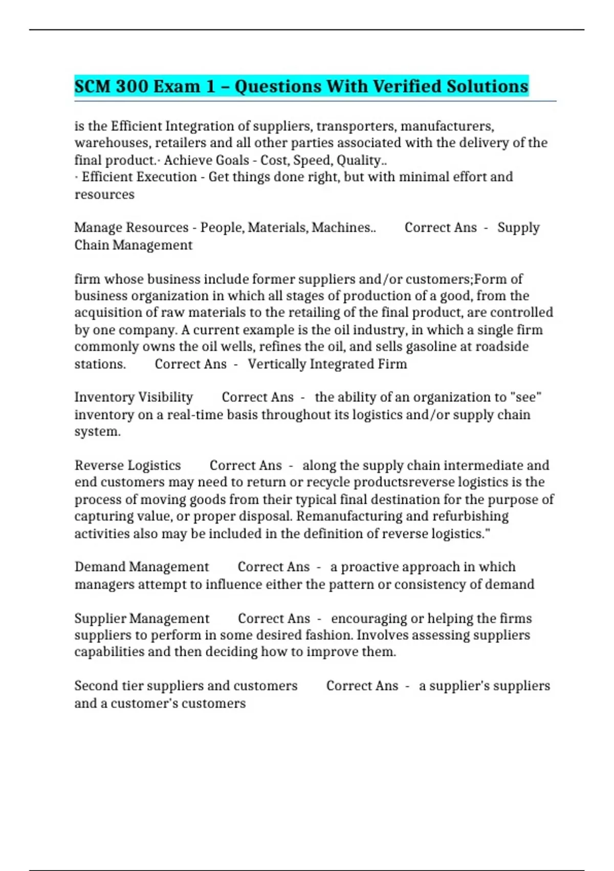 SCM 300 Exam 1 – Questions With Verified Solutions