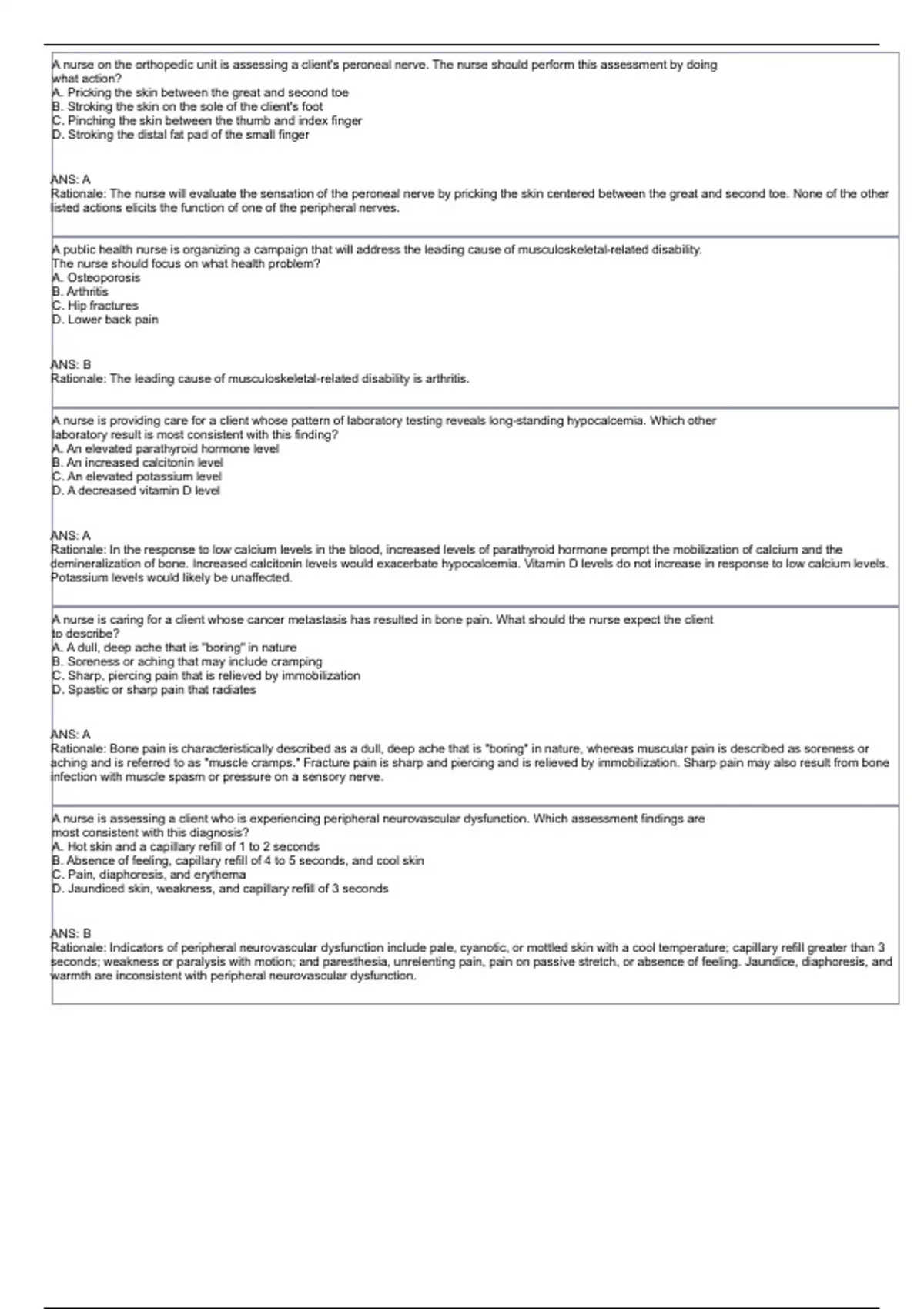 Rationale: The nurse will evaluate the sensation of the peroneal nerve by pricking the skin centered between the great and second toe. None of the other
