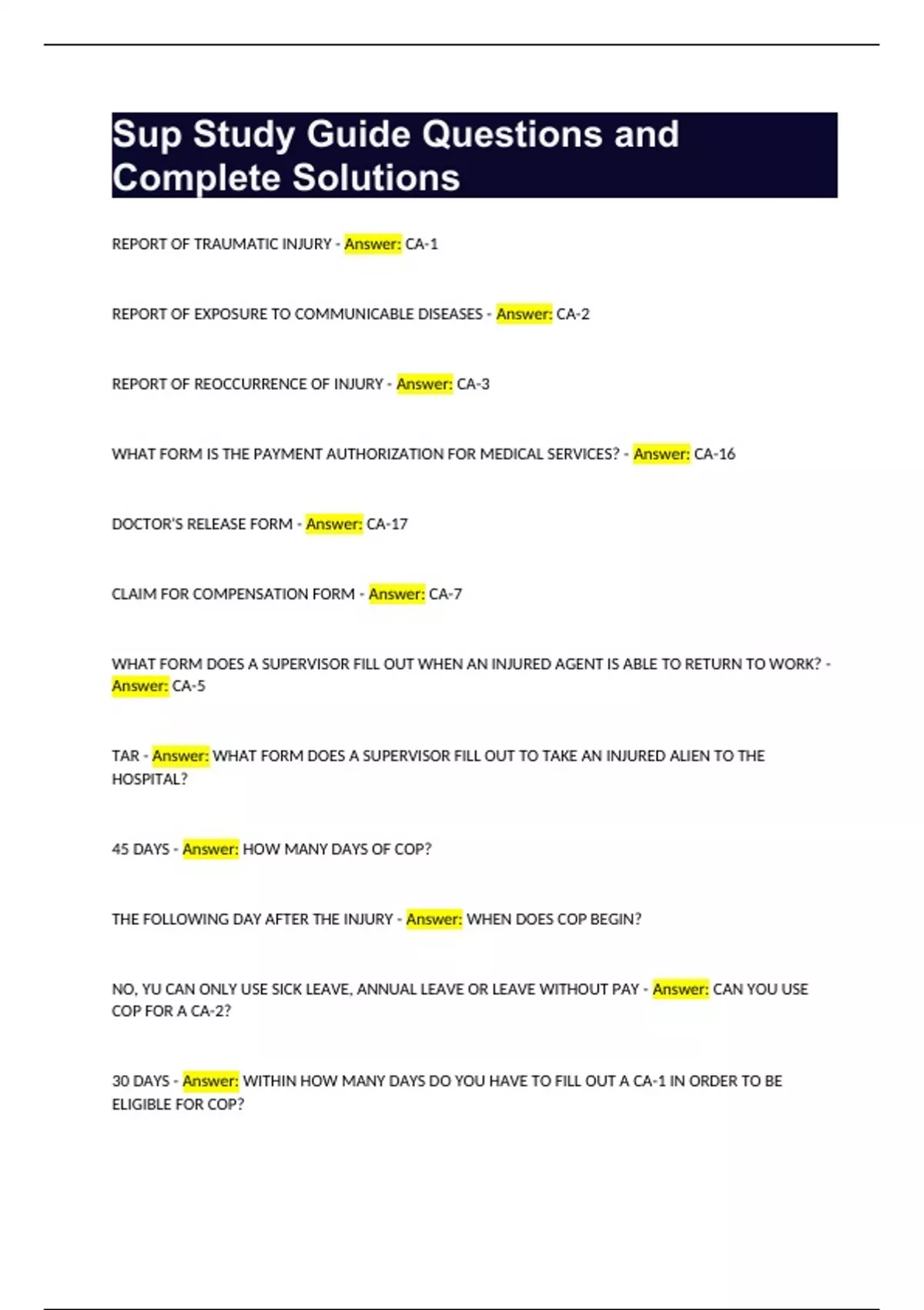 Sup Study Guide Questions and Complete Solutions REPORT OF TRAUMATIC INJURY - Answer: CA-1 REPORT OF EXPOSURE TO COMMUNICABLE DISEASES - Answer: CA-2 REPORT OF REOCCURRENCE OF INJURY - Answer: CA-3 WHAT FORM IS THE PAYMENT AUTHORIZATION FOR MEDICAL SERVICES? - Answer: CA-16 DOCTOR'S RELEASE FORM - Answer: CA-17 CLAIM FOR COMPENSATION FORM - Answer: CA-7 WHAT FORM DOES A SUPERVISOR FILL OUT WHEN AN INJURED AGENT IS ABLE TO RETURN TO WORK? - Answer: CA-5 TAR - Answer: WHAT FORM DOES A SUPERVISOR FILL OUT TO TAKE AN INJURED ALIEN TO THE HOSPITAL? 45 DAYS - Answer: HOW MANY DAYS OF COP? THE FOLLOWING DAY AFTER THE INJURY - Answer: WHEN DOES COP BEGIN? NO, YU CAN ONLY USE SICK LEAVE, ANNUAL LEAVE OR LEAVE WITHOUT PAY - Answer: CAN YOU USE COP FOR A CA-2? 30 DAYS - Answer: WITHIN HOW MANY DAYS DO YOU HAVE TO FILL OUT A CA-1 IN ORDER TO BE ELIGIBLE FOR COP? US vs MARTINEZ-FUERTE - Answer: WHAT CASE PROVIDES GUIDELINES FOR BORDER PATROL CHECKPOINTS? 3, ONE PRIMARY, ONE SECONDAY, AND ONE BACKUP OR ROVING PATROL - Answer: WHAT IS THE MINIMUM AMOUNT OF AGENT FOR THE OPERATION OF A SINGLE LANE CHECKPOINT? US vs BRIGNONI-PONCE US - Answer: WHAT CASE PROVIDES GUIDELINES FOR ROVING PATROL VEHICLE STOPS? NONE - Answer: WHAT LEVEL OF SUSPICION DO YOU NEED TO SEND A VEHICLE TO SECONDARY? UNDER 235 AND 287 - Answer: UNDER WHAT AUTHORITY DO YOU CONDUCT A COMMON CARRIER INSPECTION? I-215B - Answer: ON WHAT FORM DO YOU RECORD STATEMENTS FROM A PRINCIPAL FOR CRIMINAL PROCEEDINGS? MIRANDA AS TO RIGHTS - Answer: Form I-214? I-215W - Answer: ON WHAT FORM DO YOU RECORD STATEMENTS FROM WITNESSES ON A CRIMINAL CASE? 18 USC 111 - Answer: WHAT SECTION OF THE LAW CAN A PERSON WHO FORCIBLY ASSAULTS, RESISTS, OPPOSES, IMPEDES, INTIMIDATES, OR INTERFERES WITH A FEDERAL OFFICER IN THE PERFORMANCE OF OFFICIAL DUTIES BE CHARGE WITH? YES - Answer: ARE SPONTANEOUS STATEMENTS FROM AN INDIVIDUAL WHOSE MIRANDA RIGHTS HAVE NOT BEEN READ OR ADVISED BE ADMISSIBLE IN COURT? What section of the law confers the Attorney General with the powerto control and guard the bounderies of the USA against the illegal entry of aliens? - Answer: INA 103 What section of the law grants Border Patrol the authority to interrogate, arrest, board and search within territorial waters? - Answer: Section 287. What section of the law provides the authority to administer oath and board conveyances in which they believe aliens are being brought in? - Answer: Section 235. Is EAP voluntary? - Answer: Yes. When is it mandatory for supervisors to refer anemployee for EAP? - Answer: It's only mandatory when there is a positive drug test or arrest. How many sessions of EAP? - Answer: 12 sessions. Is EAP a disciplinary action? - Answer: No. Does EAP go in your personal record? - Answer: No. What form is CBP 6310? - Answer: US Government warning. What section of the law can you charge an alien 18 yrs of age and older without an alien registration card? - Answer: 8 USC 1304, a fine not to exceed $100 dollars and no more than 30 days or both. It's a misdemeaner offense. How many more agents do you need gor multi lane checkpoints? - Answer: One per each additional lane and one additional secondary per two of primary. What is form CBP 502? - Answer: Safety Data Sheet. Within how many days must employees who believe they were subject of discrimination file a complaint? - Answer: Within 45 days. What is form SF 91? - Answer: Operators report of motor vehicle accident. It must be completed by the driver and turned into a supervisor within 24 hours. What is form SF 95? - Answer: Claim for damage, injury or death. What is form SF 94? - Answer: Witness statement of vehicle accident. What is form CBP 52? - Answer: It's a survey for lost damage or destroyed property. Only complete when damage is greater than $2,499 dollars or willful intent or gross negligence. What is form CBP 177? - Answer: Vehicle operations report and purchase log.Home to work vehicle use log. What is form CBP 58? - Answer: Vehicle vessel and aircraft inventory receipt. What is form CBP 179? - Answer: Home to work use log. Can a CTDD be deployed for another agency? - Answer: Yes, you need supervisor approval, unless emergency. What area a prohibited to deploy a CTDD device? - Answer: School zones or any public places. On what vehicles can a CTDD not be deployed on? - Answer: Three wheel, school buses and any vehicle believed to be transporting hazardous materials. What form is the I-216? - Answer: Record of person and property transfer. When transporting aliens on a commercial airline advise must be given within what time period? - Answer: One day before the anticipated flight. What is form I-770? - Answer: Notice of rights and request for disposition on juveniles. What is CBP Form 93? - Answer: Unaccompanied Alien Child Screening Addendum What Form is I-134? - Answer: Affidavit of support. How long can you keep a juvenile in a border patrol station? - Answer: A maximum of 24 hours. How much time does CBP have to place a juvenile in an appropriate facility? - Answer: 72 hours, if extenuating circumstances 5 days are allowed under Flores vs Reno aggreement. What is the Juvenile custodian order of preference? - Answer: Parents, legal guardian or an adult relative or entity designated by parents or legal guardian. All juveniles must have.... - Answer: Water, food, medical, adequate temperature, ventilation and supervision. SIR reporting procedures... - Answer: If terrorist related immediately call the Commisioners Situation Room and then in writing. All other, call within 2 hours and written within 4 hours. How many agents do you need at all times in the evidence room? - Answer: Two agents at all times. What is considered high risk property? - Answer: Controlled substances, currency, firearms and ammunition. Within how many hours must all high risk property be turn over to the CBP vault? - Answer: 72 hours. What is CBP 58? - Answer: Vehicle, vessel and aircraft inventory receipt. What is CBP 6051S? - Answer: Cu