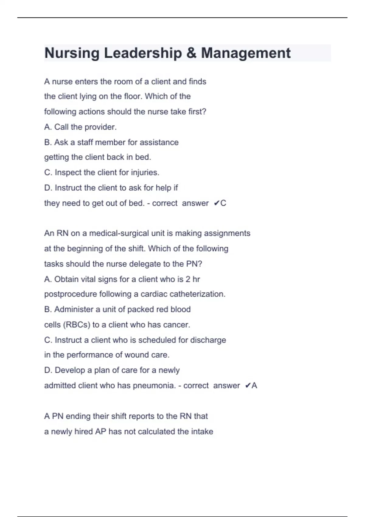 Nursing Leadership PN Management Fortis College - Question and answers 100% correct Nursing Leadership & Management A nurse enters the room of a client and finds the client lying on the floor. Which of the following actions should the nurse take first? A. Call the provider. B. Ask a staff member for assistance getting the client back in bed. C. Inspect the client for injuries. D. Instruct the client to ask for help if they need to get out of bed. - correct answer C An RN on a medical-surgical unit is making assignments at the beginning of the shift. Which of the following tasks should the nurse delegate to the PN? A. Obtain vital signs for a client who is 2 hr postprocedure following a cardiac catheterization. B. Administer a unit of packed red blood cells (RBCs) to a client who has cancer. C. Instruct a client who is scheduled for discharge in the performance of wound care. D. Develop a plan of care for a newly admitted client who has pneumonia. - correct answer A A PN ending their shift reports to the RN that a newly hired AP has not calculated the intake and output for several clients. Which of the following actions should the RN take? A. Complete an inciden