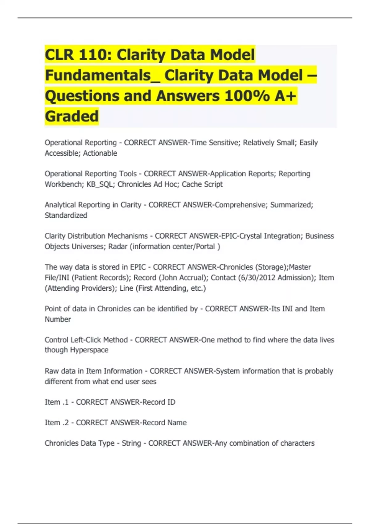 CLR 110: Clarity Data Model Fundamentals_ Clarity Data Model – Questions and Answers 100% A+ Graded Operational Reporting - CORRECT ANSWER-Time Sensitive; Relatively Small; Easily Accessible; Actionable Operational Reporting Tools - CORRECT ANSWER-Application Reports; Reporting Workbench; KB_SQL; Chronicles Ad Hoc; Cache Script Analytical Reporting in Clarity - CORRECT ANSWER-Comprehensive; Summarized; Standardized Clarity Distribution Mechanisms - CORRECT ANSWER-EPIC-Crystal Integration; Business Objects Universes; Radar (information center/Portal ) The way data is stored in EPIC - CORRECT ANSWER-Chronicles (Storage);Master File/INI (Patient Records); Record (John Accrual); Contact (6/30/2012 Admission); Item (Attending Providers); Line (First Attending, etc.) Point of data in Chronicles can be identified by - CORRECT ANSWER-Its INI and Item Number Control Left-Click Method - CORRECT ANSWER-One method to find where the data lives though Hyperspace Raw data in Item Information - CORRECT ANSWER-System information that is probably different from what end user sees Item .1 - CORRECT ANSWER-Record ID Item .2 - CORRECT ANSWER-Record Name Chronicles Data Type - String - CORRECT ANSWER-Any combination of characters Chronicles Data Type - Number - CORRECT ANSWER-Any number - can be an integer or a decimal Chronicles Data Type - Time - CORRECT ANSWER-A time without a date; stored as the number of seconds since midnight; converted back to normal time for display Chronicles Data Type - Instant - CORRECT ANSWER-Date/Time stored in single item as the number of seconds since midnight on 12/31/1840 and converted back to normal for display Chronicles Data Type - Category - CORRECT ANSWER-A pre-defined list of choices; Some can be modified by customers, some cannot Response Types - CORRECT ANSWER-Determines how many lines of data an Item can hold Response Types - Single Response - CORRECT ANSWER-Only one line of data can be stored Response Types - Multiple Response - CORRECT ANSWER-Multiple lines of data can be stored (e.g. addresses) Response Types - Related Groups - CORRECT ANSWER-Multiple lines of data can be stored and each one of these lines is related to a line in another item (e.g. Different Phone numbers ) Add Types - CORRECT ANSWER-Identifies whether a data changes on the item for each Contact or is stored directly on a record Add Types - No-Add - CORRECT ANSWER-Stores items directly on a record, not a specific contact Add Types - Response Each Time - CORRECT ANSWER-Stores values separately on each of a record's contact Add Types - Lookback - CORRECT ANSWER-Stores values separately on each contact, but assume that last value remains true until new value is entered (not used very often anymore.