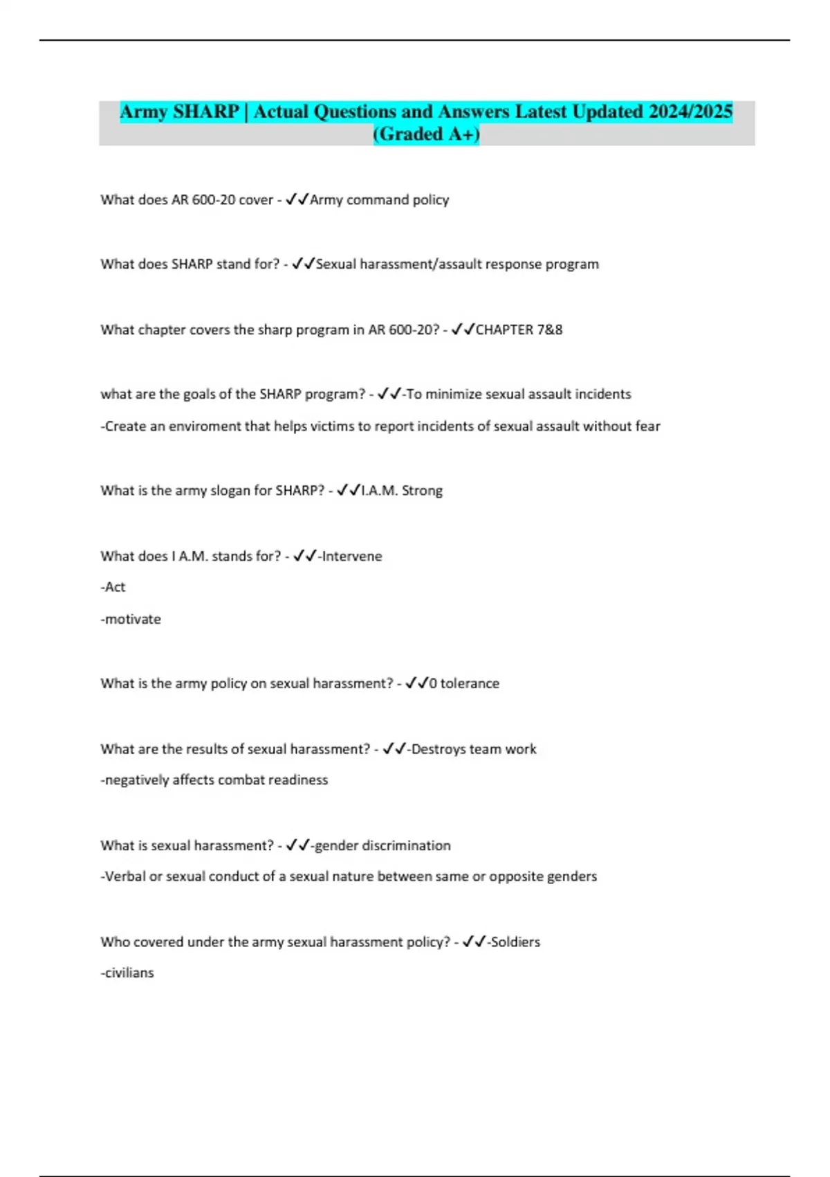 Package deal:: ARMY SHARP Exams | Actual Exam Questions And Answers Latest Updated 2024/2025 (Graded A+