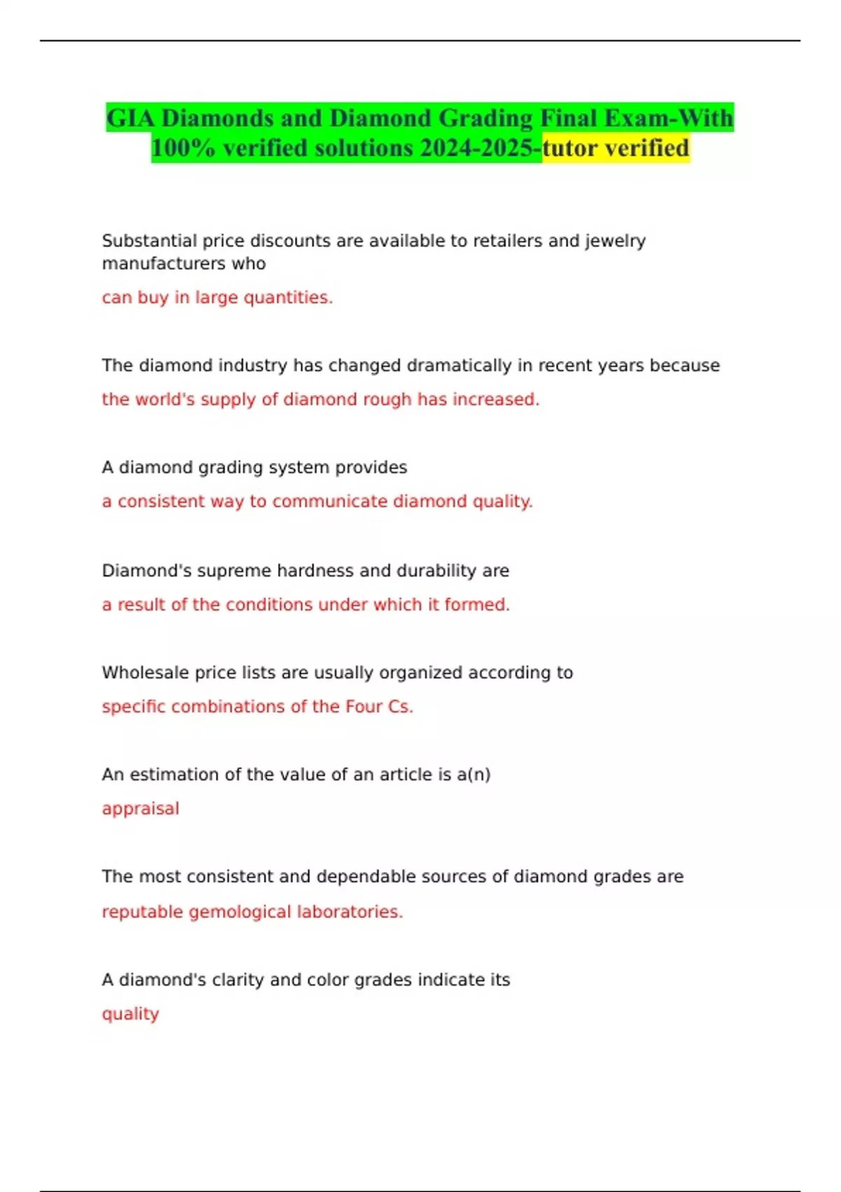 GIA Diamonds and Diamond Grading Final Exam-With 100% verified solutions -tutor verified