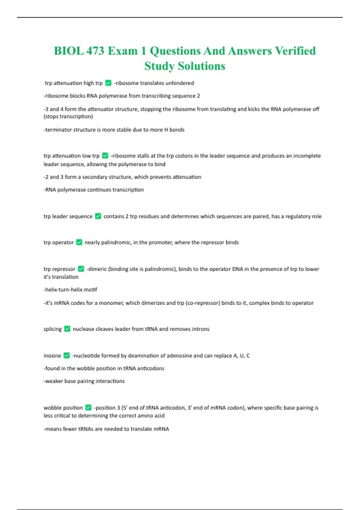 BIOL 473 Exam 1 Questions And Answers Verified Study Solutions trp attenuation high trp -ribosome translates unhindered -ribosome blocks RNA polymerase from transcribing sequence 2 -3 and 4 form the attenuator structure, stopping the ribosome from translating and kicks the RNA polymerase off (stops transcription) -terminator structure is more stable due to more H bonds trp attenuation low trp -ribosome stalls at the trp codons in the leader sequence and produces an incomplete leader sequence, allowing the polymerase to bind -2 and 3 form a secondary structure, which prevents attenuation -RNA polymerase continues transcription