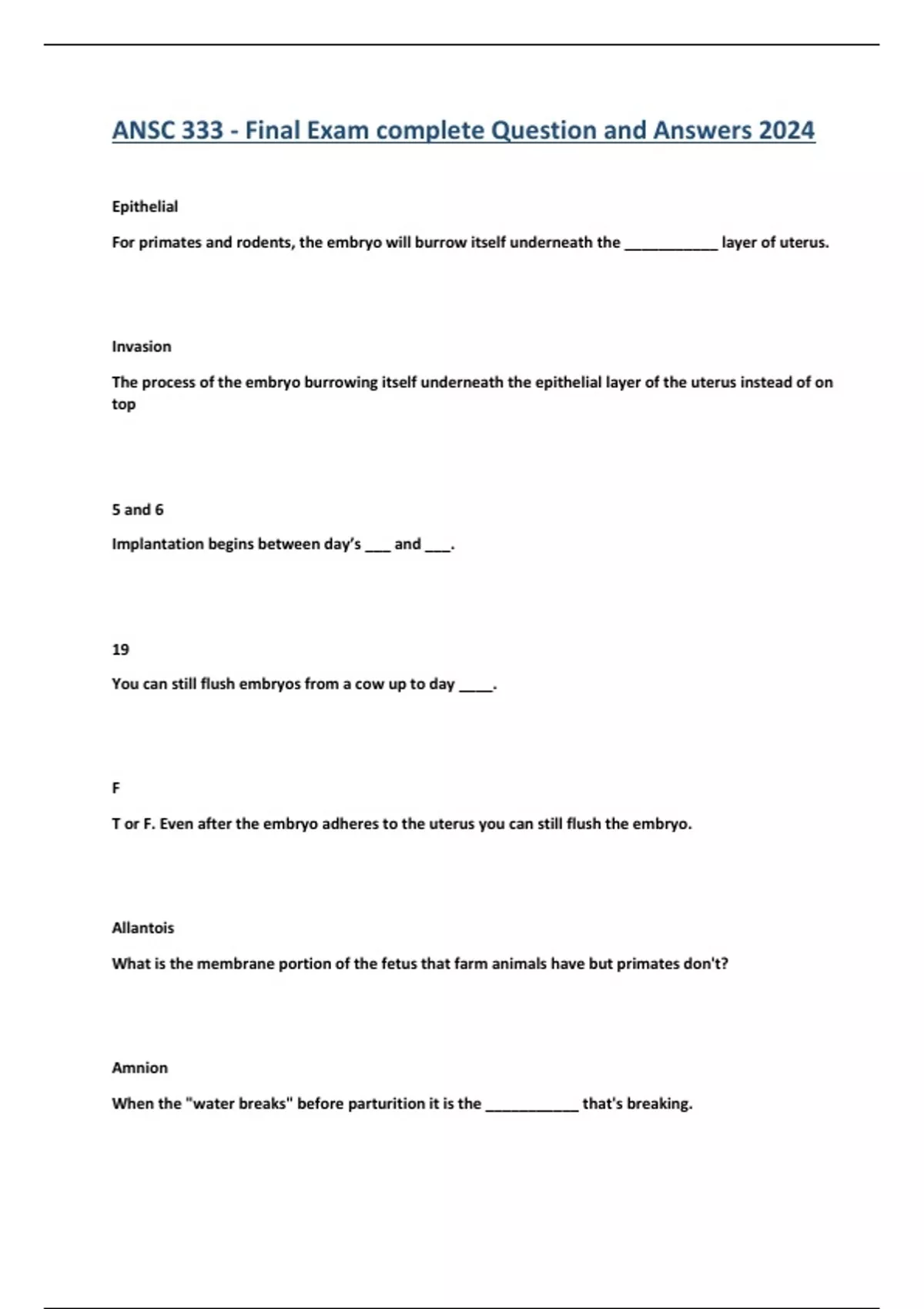 ANSC 333 - Final Exam complete Question and Answers 2024 Epithelial For primates and rodents, the embryo will burrow itself underneath the ___________ layer of uterus. Invasion The process of the embryo burrowing itself underneath the epithelial layer of the uterus instead of on top 5 and 6 Implantation begins between day’s ___ and ___. 19 You can still flush embryos from a cow up to day ____. F T or F. Even after the embryo adheres to the uterus you can still flush the embryo. Allantois What is the membrane portion of the fetus that farm animals have but primates don't? Amnion When the "water breaks" before parturition it is the ___________ that's breaking. HCG (human chorionic gonadotropin) The protein that appears in human urine that indicates the female is pregnant For increased surface area (nutrition, etc.) Why does an embryo elongate? Elongate Not all embryos can ___________. Since they are not strong enough to go through this, this is the window where we lose the most embryos. 95% What is the average fertilization rate? (NOT PREGNANCY) Mother The biggest threat to the embryo is the ____________. Growth of the embryo and estrus Giving progesterone accelerates _____________________ and ______________. Progesterone During lute lysis, pgf2alpha pulses causes a decrease in __________________. Oxytocin When ______________ gets dumped into the body pgf2alpha rises. But if there's no receptor it can NOT be released. Interferon tau Maternal recognition of pregnancy signal produced by ruminants; blocks the oxytocin receptor Oxytocin Receptor Interferon tau blocks the ________________ ______________ so when oxytocin gets made it can't get released. Thus, there are no effects and luteolysis is prevented. Multinucleated syncytial (produce specific pregnancy hormones, make pregnancy test positive) After a certain point, some of the cells in the trophoblast start to reform into a ___________________ ______________ cell. No Can the release of pgf2alpha be stopped in pigs? Apical rather than basal The goal for pgf2alpha release in pigs is for it to be ______ rather than ________. Uterus Interferon Tau binds to its receptor and acts on the epithelium of the ______________. Now there is no oxytocin receptor. Elongation The process of the trophoblast cells elongating and producing interferon tau Will not If pgf2alpha is released as apical then the hormone _________ go into the bloodstream. luteolysis If the hormones can't get into the bloodstream then they can't get to the ovaries. Thus, ____________ is prevented. Estradiol (could be others but now it's just estradiol) _________________ is the maternal recognition hormone in the sow. Because they are a litter bearing species Why does the pig's embryo stretch more than other species? There is more competition The stretching of the embryo in pigs is faster than in other species. Why? Necrotic tip The main sensor on the embryos that are somehow used to send a signal when they stretch out so then they don't merge/collide (very important in pigs) We don't know What is the maternal recognition hormone in horses? Horse’s (has an extra protective layer around the ZP for this purpose) A ______________ embryo will migrate around the uterus while emitting a presence signal to the mother. Their embryos do NOT elongate. By squashing the fluid sacks; no How do you kill one of the twins in horses? Can you do this in other species? The horse has separate sacks and for other species they're joined Why can't you squash the fluid sacks in any other species besides the horse? Tape worm If you flush an embryo at day 16 it will look like a _________________. To generate more offspring to form a single, elite female What is the goal for superovulation? To synchronize donor and recipient female What is the first step for embryo transfer? The side with the CL If a recipient female has a CL, you will need to implant the embryo on _________________________________. folltropin The only product currently approved for superovulation is _________________. uterus Embryos have to be in the _______________ for collection. maintain quality of the oocytes (they need to be able to mature