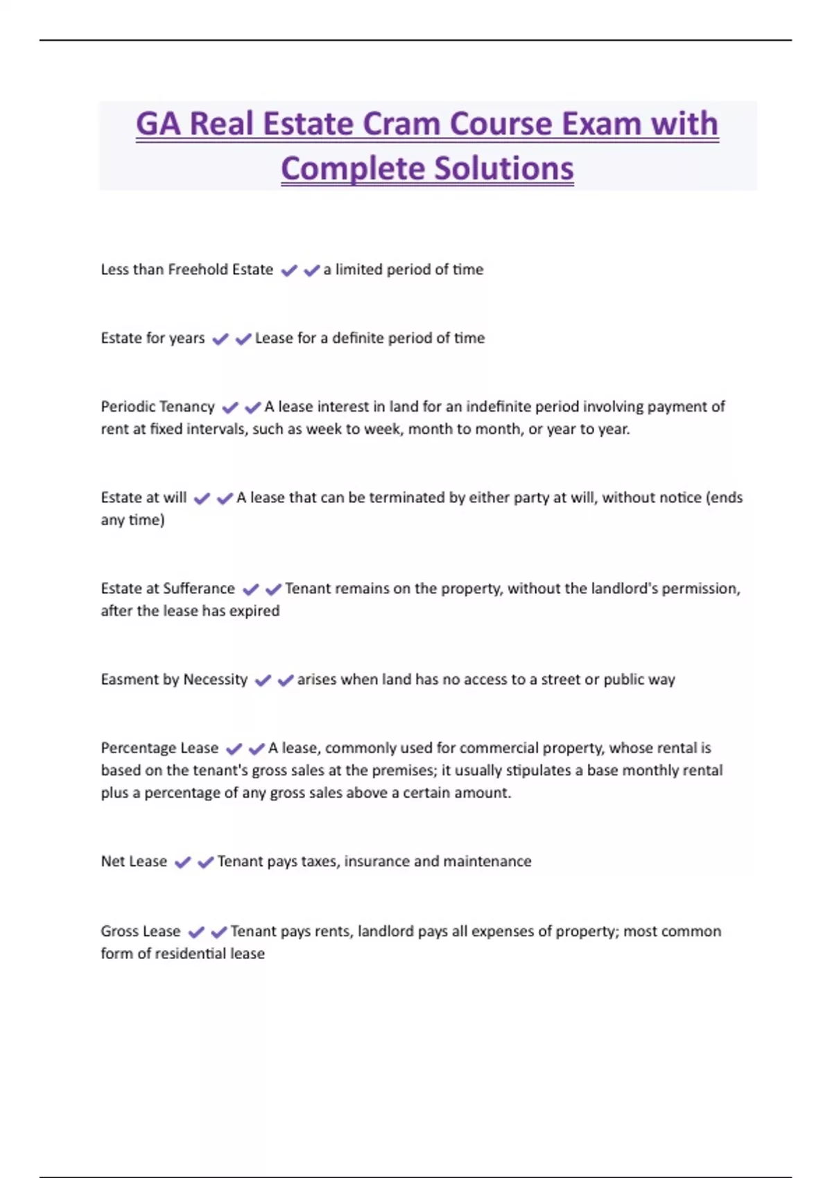 GA Real Estate Cram Course Exam with Complete Solutions Less than Freehold Estate a limited period of time Estate for years Lease for a definite period of time Periodic Tenancy A lease interest in land for an indefinite period involving payment of rent at fixed intervals, such as week to week, month to month, or year to year. Estate at will A lease that can be terminated by either party at will, without notice (ends any time) Estate at Sufferance Tenant remains on the property, without the landlord's permission, after the lease has expired Easment by Necessity arises when land has no access to a street or public way