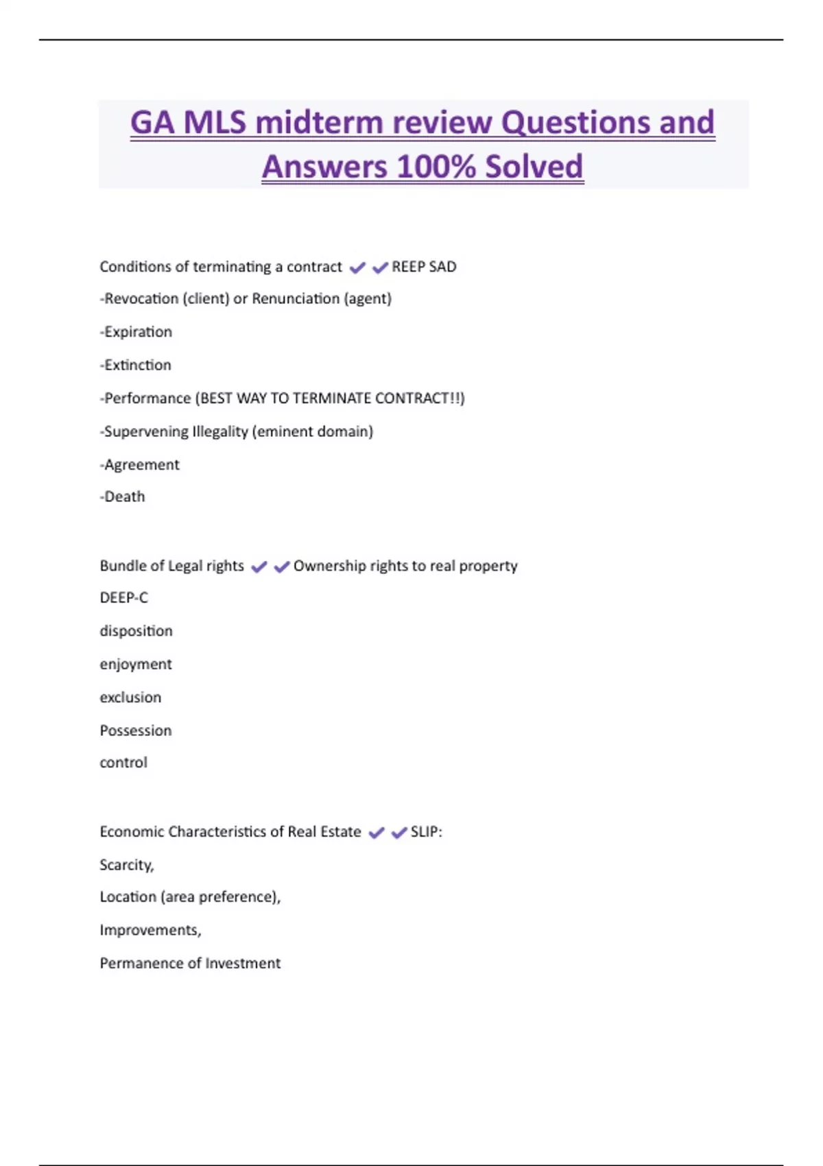 GA MLS midterm review Questions and Answers 100% Solved Conditions of terminating a contract REEP SAD -Revocation (client) or Renunciation (agent) -Expiration -Extinction -Performance (BEST WAY TO TERMINATE CONTRACT!!) -Supervening Illegality (eminent domain) -Agreement -Death Bundle of Legal rights Ownership rights to real property DEEP-C disposition enjoyment exclusion Possession control Economic Characteristics of Real Estate SLIP: