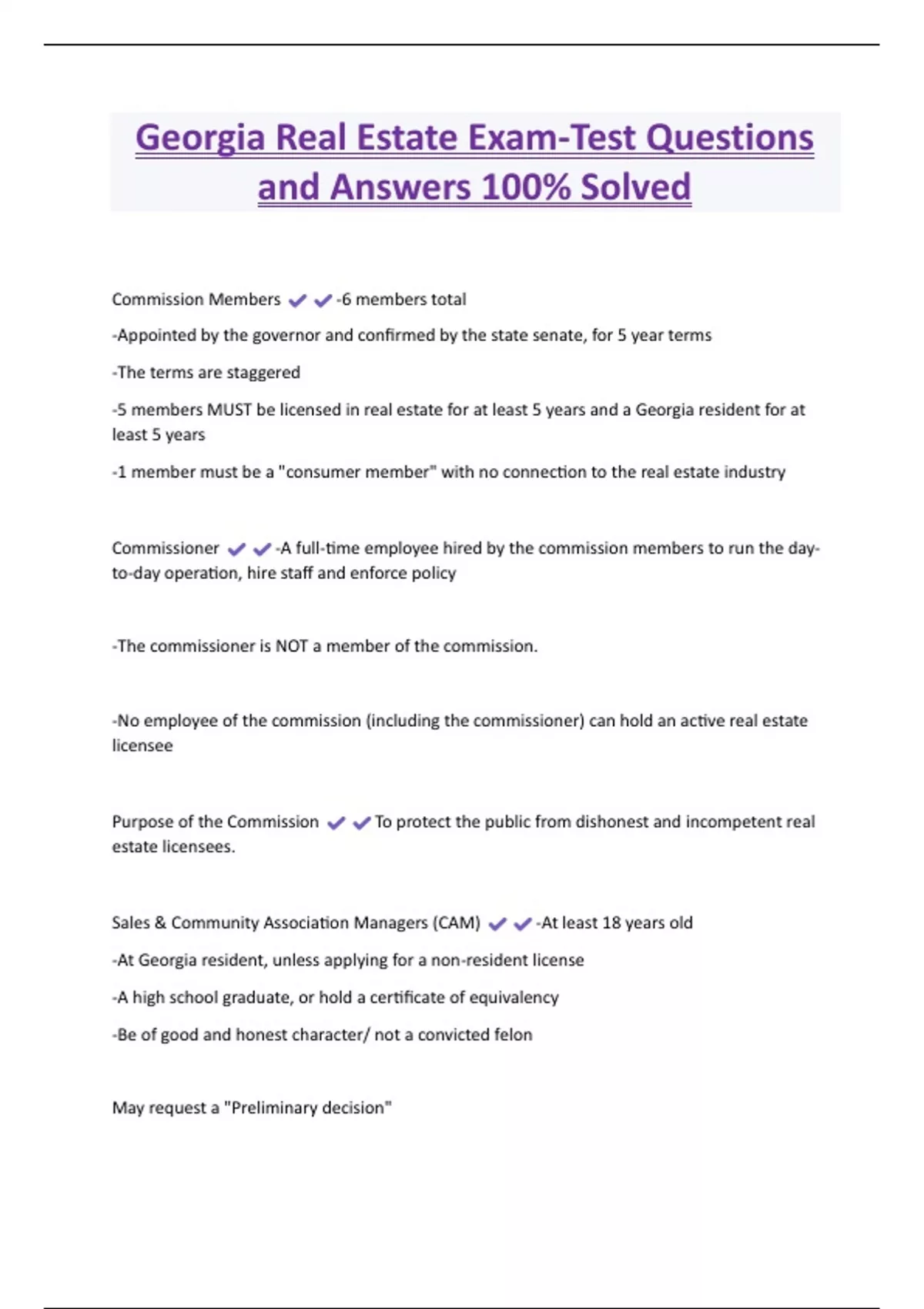 Georgia Real Estate Exam-Test Questions and Answers 100% Solved Commission Members -6 members total -Appointed by the governor and confirmed by the state senate, for 5 year terms -The terms are staggered -5 members MUST be licensed in real estate for at least 5 years and a Georgia resident for at least 5 years -1 member must be a "consumer member" with no connection to the real estate industry Commissioner -A full-time employee hired by the commission members to run the dayto-day operation, hire staff and enforce policy -The commissioner is NOT a member of the commission. -No employee of the commission (including the commissioner) can hold an active real estate licensee Purpose of the Commission To protect the public from dishonest and incompetent real
