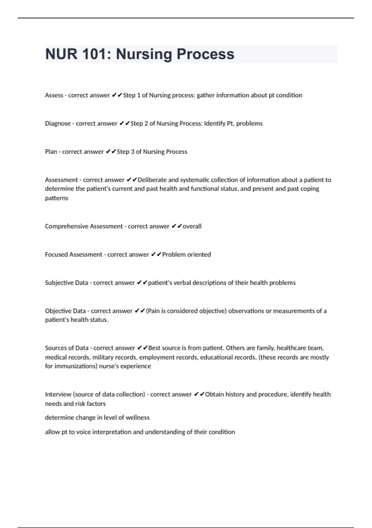 NUR 101: Nursing ProcessAssess - correct answer Step 1 of Nursing process: gather information about pt condition Diagnose - correct answer Step 2 of Nursing Process: Identify Pt. problems Plan - correct answer Step 3 of Nursing Process Assessment - correct answer Deliberate and systematic collection of information about a patient to determine the patient's current and past health and functional status, and present and past coping patterns Comprehensive Assessment - correct answer overall Focused Assessment - correct answer Problem oriented Subjective Data - correct answer patient's verbal descriptions of their health problems Objective Data - correct answer (Pain is considered objective) observations or measurements of a patient's health status. Sources of Data - correct answer Best source is from patient. Others are family, healthcare team, medical records, military records, employment records, educational records, (these records are mostly for immunizations) nurse's experience
