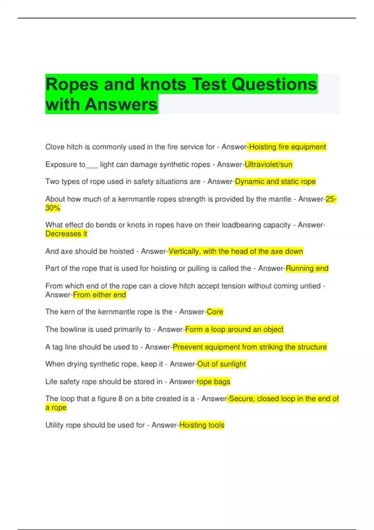 Ropes and knots Test Questions with Answers Clove hitch is commonly used in the fire service for - Answer-Hoisting fire equipment Exposure to___ light can damage synthetic ropes - Answer-Ultraviolet/sun Two types of rope used in safety situations are - Answer-Dynamic and static rope About how much of a kernmantle ropes strength is provided by the mantle - Answer-25-30% What effect do bends or knots in ropes have on their loadbearing capacity - Answer-Decreases it And axe should be hoisted - Answer-Vertically, with the head of the axe down Part of the rope that is used for hoisting or pulling is called the - Answer-Running end From which end of the rope can a clove hitch accept tension without coming untied - Answer-From either end The kern of the kernmantle rope is the - Answer-Core The bowline is used primarily to - Answer-Form a loop around an object A tag line should be used to - Answer-Preevent equipment from striking the structure When drying synthetic rope, keep it - Answer-Out of sunlight Life safety rope should be stored in - Answer-rope bags The loop that a figure 8 on a bite created is a - Answer-Secure, closed loop in the end of a rope