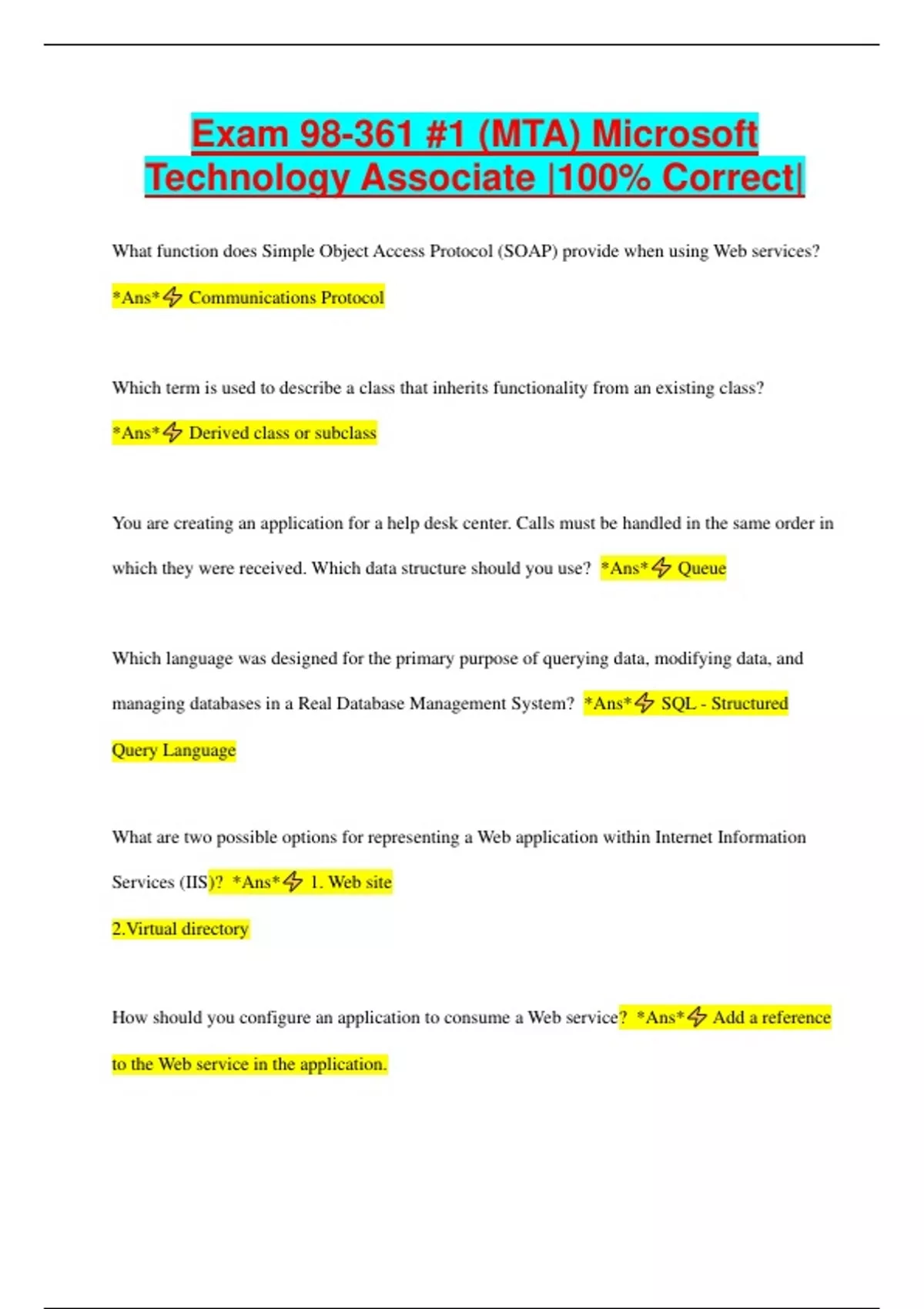 Exam 98-361 #1 (MTA) Microsoft Technology Associate |100% Correct| What function does Simple Object Access Protocol (SOAP) provide when using Web services? *Ans* Communications Protocol Which term is used to describe a class that inherits functionality from an existing class? *Ans* Derived class or subclass You are creating an application for a help desk center. Calls must be handled in the same order in which they were received. Which data structure should you use? *Ans* Queue Which language was designed for the primary purpose of querying data, modifying data, and managing databases in a Real Database Management System? *Ans* SQL - Structured Query Language What are two possible options for representing a Web application within Internet Information Services (IIS)? *Ans* 1. Web site 2.Virtual directory How should you configure an application to consume a Web service? *Ans* Add a reference to the Web service in the application. You are creating an application that accepts input and displays a response to the user. You cannot create a graphical interface for this application. Which type of application should you create? *Ans* Console-Based You are creating an application that presents users with a graphical interface. Users will run this application from remote computers. Some of the remote computers do not have the .NET Framework installed. Users do not have permissions to install software. Which type of application should you choose? *Ans* ASP.NET What are two methods that can be used to evaluate the condition of a loop at the start of each iteration? *Ans* 1.While 2.For Which type of application has the following characteristics when it is installed? -Runs continuously in the background by default when the startup type is set to automatic -Presents no user interface *Ans* Windows Service In the application life cycle, the revision of an application after it has been deployed is referred to as? *Ans* Maintenance You need to create a property in a class. Consumers of the class must be able to read the values of the property. Which property procedure should you include? *Ans* Get accessor