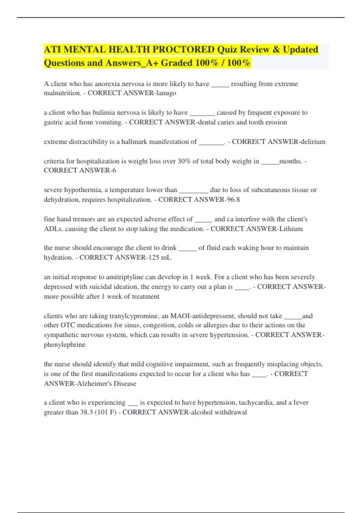 ATI MENTAL HEALTH PROCTORED Quiz Review & Updated Questions and Answers_A+ Graded 100% / 100% A client who has anorexia nervosa is more likely to have _____ resulting from extreme malnutrition. - CORRECT ANSWER-lanugo a client who has bulimia nervosa is likely to have _______ caused by frequent exposure to gastric acid from vomiting. - CORRECT ANSWER-dental caries and tooth erosion extreme distractibility is a hallmark manifestation of _______. - CORRECT ANSWER-delirium criteria for hospitalization is weight loss over 30% of total body weight in _____months. - CORRECT ANSWER-6 severe hypothermia, a temperature lower than ________ due to loss of subcutaneous tissue or dehydration, requires hospitalization. - CORRECT ANSWER-96.8 fine hand tremors are an expected adverse effect of _____ and ca interfere with the client's ADLs, causing the client to stop taking the medication. - CORRECT ANSWER-Lithium the nurse should encourage the client to drink _____ of fluid each waking hour to maintain hydration. - CORRECT ANSWER-125 mL an initial response to amitriptyline can develop in 1 week. For a client who has been severely depressed with suicidal ideation, the energy to carry out a plan is ____. - CORRECT ANSWER-more possible after 1 week of treatment clients who are taking tranylcypromine, an MAOI-antidepressent, should not take _____and other OTC medications for sinus, congestion, colds or allergies due to their actions on the sympathetic nervous system, which can results in severe hypertension. - CORRECT ANSWER-phenylephrine the nurse should identify that mild cognitive impairment, such as frequently misplacing objects, is one of the first manifestations expected to occur for a client who has ____. - CORRECT ANSWER-Alzheimer's Disease a client who is experiencing ___ is expected to have hypertension, tachycardia, and a fever greater than 38.3 (101 F) - CORRECT ANSWER-alcohol withdrawal a client who is experiencing alcohol withdrawal can experience profuse sweating and _____ pupils - CORRECT ANSWER-dilated benztropine is used to treat parkinsonism manifestations, such as _____ - CORRECT ANSWER-shuffling gait St. John's wort is an herbal preparation that decreases reuptake of serotonin. The nurse should advise the client that taking St. John's wort with another medication that also inhibits the reuptake of serotonin, such as ____, placed the client at risk for - CORRECT ANSWER-paroxetine _____ is common in clients who have depression. The nurse should allow the client extra time to comprehend and formulate an answer to the question. - CORRECT ANSWER-slowed response time