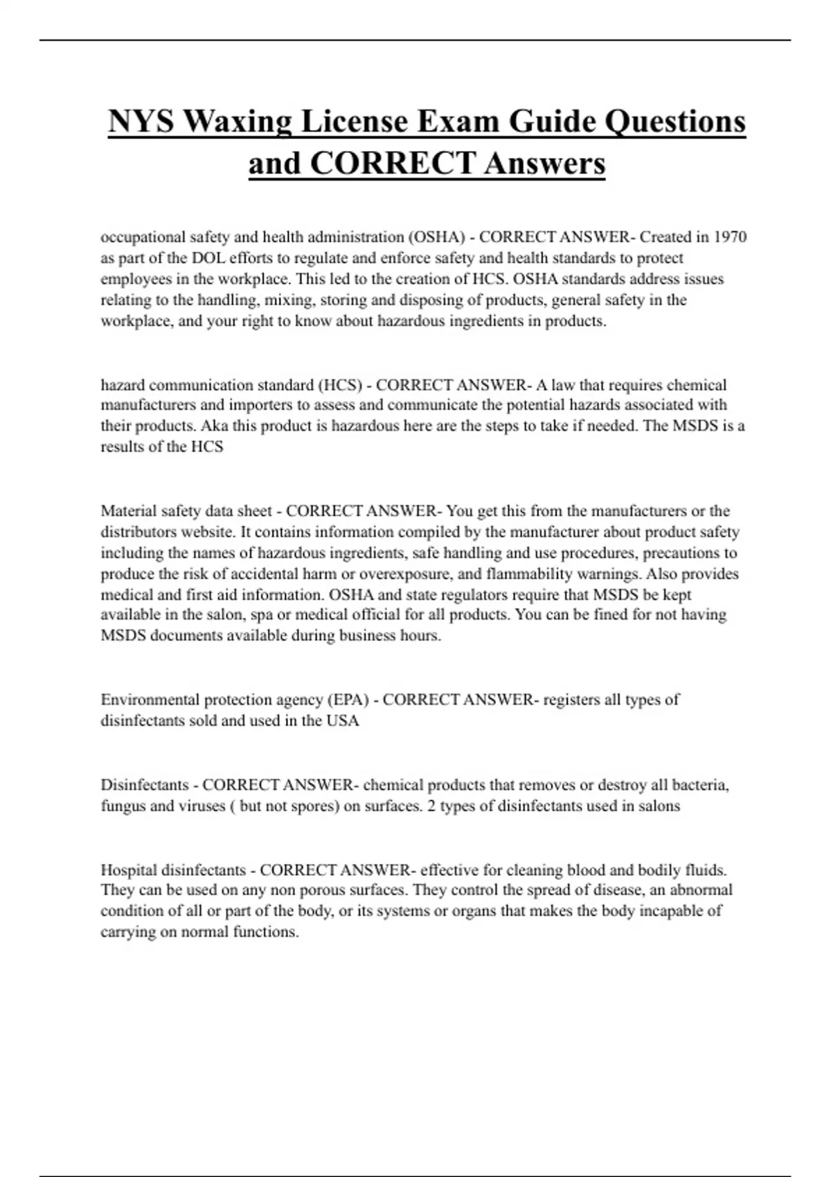 NYS Waxing License Exam Guide Questions and CORRECT Answers occupational safety and health administration (OSHA) - CORRECT ANSWER- Created in 1970 as part of the DOL efforts to regulate and enforce safety and health standards to protect employees in the workplace. This led to the creation of HCS. OSHA standards address issues relating to the handling, mixing, storing and disposing of products, general safety in the workplace, and your right to know about hazardous ingredients in products