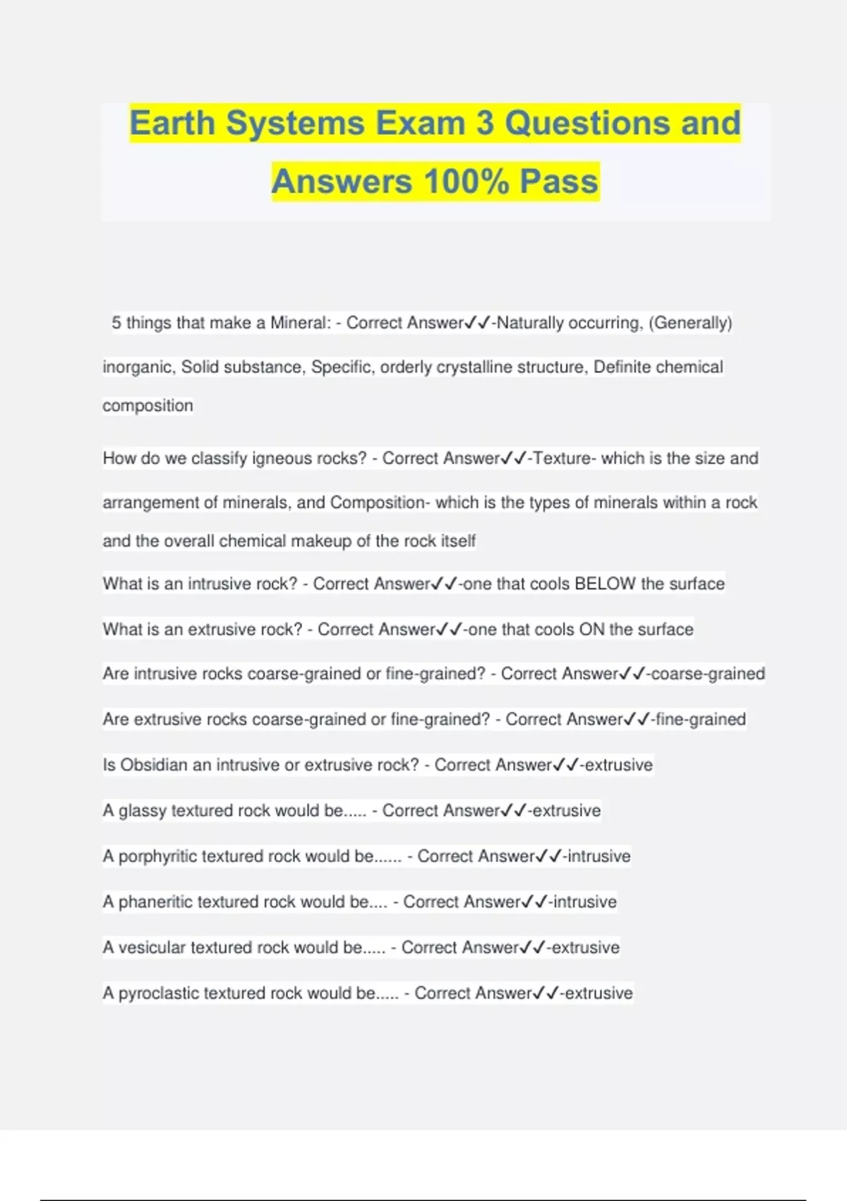 Earth Systems Exam 3 Questions and Answers 100% Pass 5 things that make a Mineral: - Correct Answer️️ -Naturally occurring, (Generally) inorganic, Solid substance, Specific, orderly crystalline structure, Definite chemical composition How do we classify igneous rocks? - Correct Answer️️ -Texture- which is the size and arrangement of minerals, and Composition- which is the types of minerals within a rock and the overall chemical makeup of the rock itself What is an intrusive rock? - Correct Answer️️ -one that cools BELOW the surface What is an extrusive rock? - Correct Answer️️ -one that cools ON the surface Are intrusive rocks coarse-grained or fine-grained? - Correct Answer️️ -coarse-grained Are extrusive rocks coarse-grained or fine-grained? - Correct Answer️️ -fine-grained Is Obsidian an intrusive or extrusive rock? - Correct Answer️️ -extrusive A glassy textured rock would be..... - Correct Answer️️ -extrusive A porphyritic textured rock would be...... - Correct Answer️️ -intrusive A phaneritic textured rock would be.... - Correct Answer️️ -intrusive A vesicular textured rock would be..... - Correct Answer️️ -extrusive A pyroclastic textured rock would be..... - Correct Answer️️ -extrusive A aphanitic textured rock would be...... - Correct Answer️️ -extrusive Granite is - Correct Answer️️ -Intrusive Rhyolite is - Correct Answer️️ -Extrusive Diorite is - Correct Answer️️ -Intrusive Andesite is - Correct Answer️️ -Extrusive Gabbro is - Correct Answer️️ -Intrusive Basalt is - Correct Answer️️ -Extrusive Obsidian is - Correct Answer️️ -Extrusive Pumice is - Correct Answer️️ -Extrusive Scoria is - Correct Answer️️ -Extrusive Tuff is - Correct Answer️️ -Extrusive How do we get clastic rocks? - Correct Answer️️ -Weathering(not
