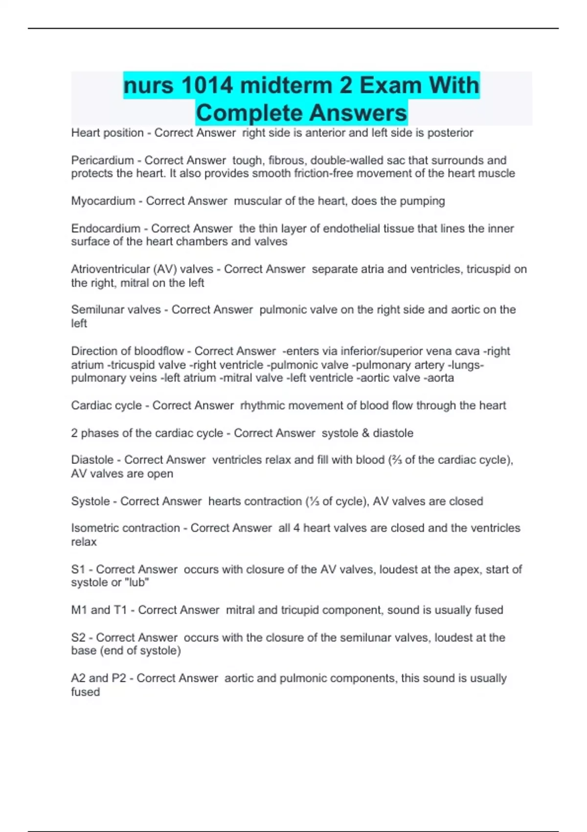 nurs 1014 midterm 2 Exam With Complete Answers Heart position - Correct Answer right side is anterior and left side is posterior Pericardium - Correct Answer tough, fibrous, double-walled sac that surrounds and protects the heart. It also provides smooth friction-free movement of the heart muscle Myocardium - Correct Answer muscular of the heart, does the pumping Endocardium - Correct Answer the thin layer of endothelial tissue that lines the inner surface of the heart chambers and valves Atrioventricular (AV) valves - Correct Answer separate atria and ventricles, tricuspid on the right, mitral on the left Semilunar valves - Correct Answer pulmonic valve on the right side and aortic on the left Direction of bloodflow - Correct Answer -enters via inferior/superior vena cava -right atrium -tricuspid valve -right ventricle -pulmonic valve -pulmonary artery -lungs-pulmonary veins -left atrium -mitral valve -left ventricle -aortic valve -aorta Cardiac cycle - Correct Answer rhythmic movement of blood flow through the heart 2 phases of the cardiac cycle - Correct Answer systole & diastole Diastole - Correct Answer ventricles relax and fill with blood (⅔ of the cardiac cycle), AV valves are open Systole - Correct Answer hearts contraction (⅓ of cycle), AV valves are closed Isometric contraction - Correct Answer all 4 heart valves are closed and the ventricles relax S1 - Correct Answer occurs with closure of the AV valves, loudest at the apex, start of systole or "lub" M1 and T1 - Correct Answer mitral and tricupid component, sound is usually fused S2 - Correct Answer occurs with the closure of the semilunar valves, loudest at the base (end of systole) A2 and P2 - Correct Answer aortic and pulmonic components, this sound is usually fused