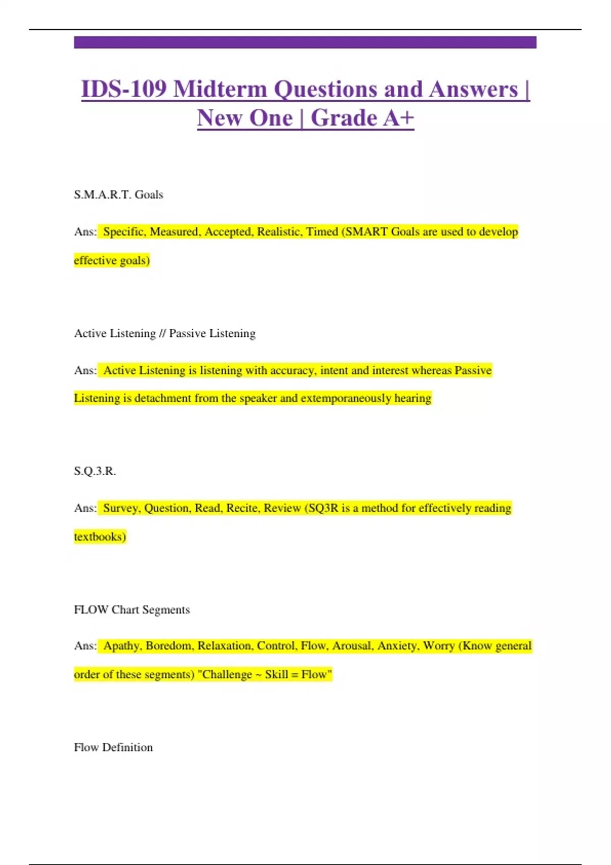 S.M.A.R.T. Goals Ans: Specific, Measured, Accepted, Realistic, Timed (SMART Goals are used to develop effective goals) Active Listening // Passive Listening Ans: Active Listening is listening with accuracy, intent and interest whereas Passive Listening is detachment from the speaker and extemporaneously hearing S.Q.3.R. Ans: Survey, Question, Read, Recite, Review (SQ3R is a method for effectively reading textbooks) FLOW Chart Segments Ans: Apathy, Boredom, Relaxation, Control, Flow, Arousal, Anxiety, Worry (Know general order of these segments) "Challenge ~ Skill = Flow" Flow Definition Ans: A state on intrinsic motivation, being "in the zone" and putting 100% into a task or activity. When both "Challenge" and "Skill" are high for said task or activity Note Taking Methods Ans: Cornell method, outlining method, mind mapping method, sentence method, charting method I. D. E. A. Ans: Identify, Determine, Explore, Act (IDEA is used to make ethical decisions) P. E. E. L. Ans: Point, Evidence, Explain, Link (PEEL is used to write effective paragraphs) Locus of Control Ans: The degree to which people believe they have influence over the outcome of events in their lives. An Internal LoC denotes "you" have control whereas an External LoC denotes "others" have control. Simple Sentence Ans: A simple sentence is an independent clause with no conjunction or dependent clause. Compound Sentence Ans: A compound sentence is two independent clauses joined by a conjunction (e.g., and, but, or, for, nor, yet, so). Complex Sentence Ans: A complex sentence contains one independent clause and at least one dependent clause. The clauses in a complex sentence are combined with conjunctions and subordinators, terms that help the dependent clauses relate to the independent clause. Subordinators can refer to the subject (who, which), the sequence/time (since, while), or the causal elements (because, if) of the independent clause. Compound-Complex Sentence