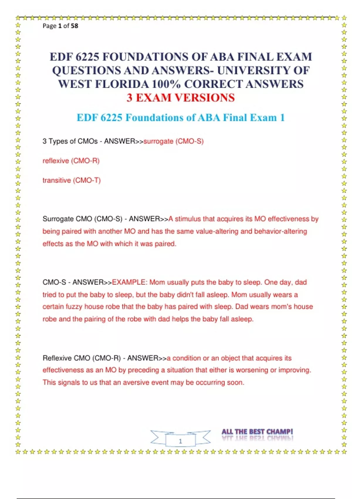 EDF 6225 Exam Foundations of ABA Final Exam Questions and Answers- University of West Florida 100% CORRECT ANSWERS