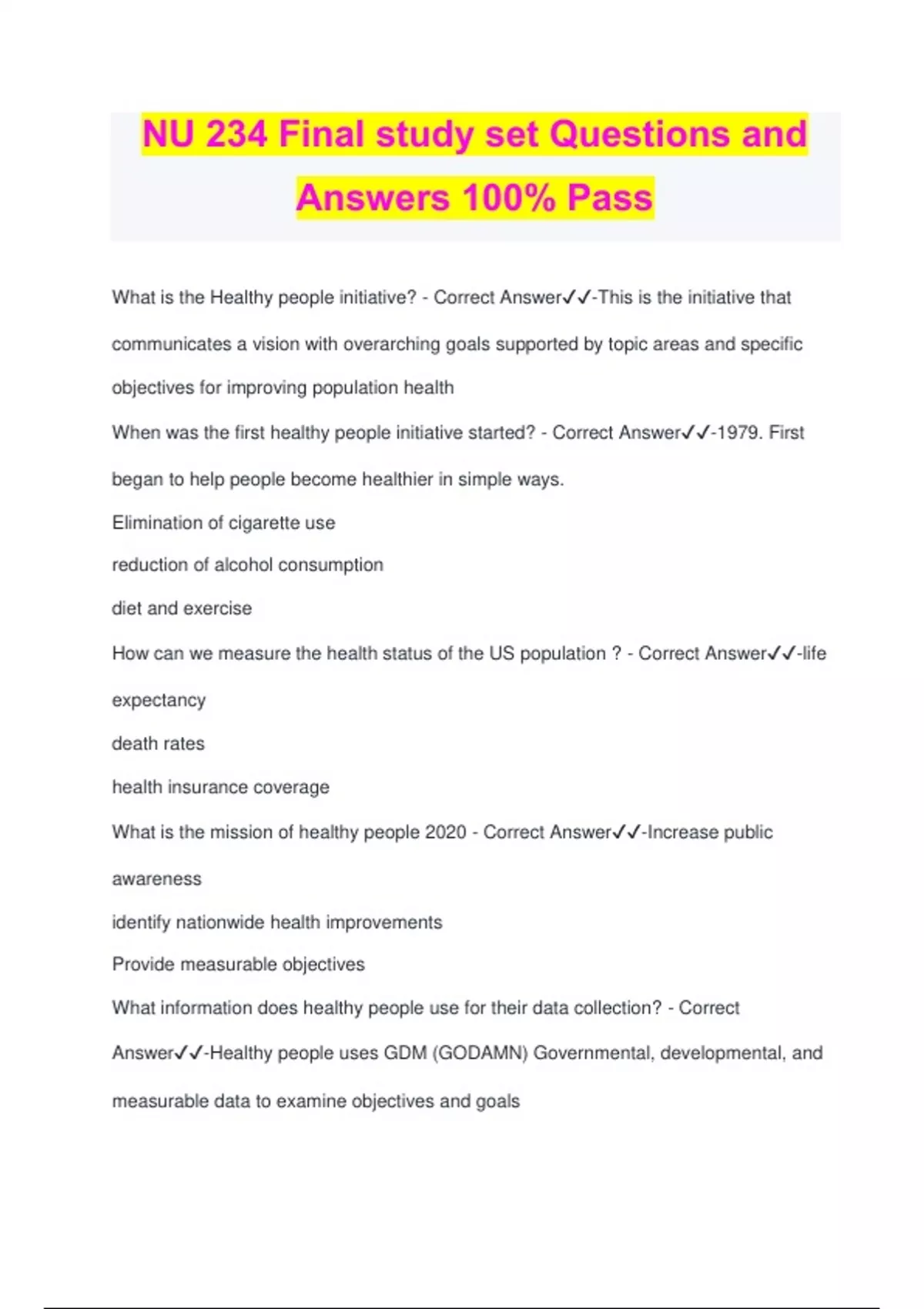 NU 234 Final study set Questions and Answers 100% Pass What is the Healthy people initiative? - Correct Answer️️ -This is the initiative that communicates a vision with overarching goals supported by topic areas and specific objectives for improving population health When was the first healthy people initiative started? - Correct Answer️️ -1979. First began to help people become healthier in simple ways. Elimination of cigarette use reduction of alcohol consumption diet and exercise How can we measure the health status of the US population ? - Correct Answer️️ -life expectancy death rates health insurance coverage What is the mission of healthy people 2020 - Correct Answer️️ -Increase public awareness identify nationwide health improvements Provide measurable objectives What information does healthy people use for their data collection? - Correct Answer️️ -Healthy people uses GDM (GODAMN) Governmental, developmental, and measurable data to examine objectives and goals What are the social determinants of health - Correct Answer️️ -Social determinants of health provide a meaning of explaining and understanding health status of individuals and groups List the social determinants of health - Correct Answer️️ -social and community needs education access healthcare and quality neighborhood and built environment economic stability What are the core objectives for healthy people 2030? - Correct Answer️️ -core objectives developmental objectives research objectives What is the triple aim approach? - Correct Answer️️ -Improvement of patient care experience improvement of health of a population reduction of per capita healthcare costs what is the medical model? - Correct Answer️️ -this is emphasizes disease rather than overall wellbeing What is the WHO definition of health? - Correct Answer️️ -Health is a state of complete physical, mental, and social well being NOT just the absence of disease or illness What is the WHO ottawa chapter definition? - Correct Answer️️ -Besides social, mental, physical health also spiritual health and sense of purpose What is health promotion? - Correct Answer️️ -Any intervention designed to foster health, increase the level of well being of an individual or group What are nursing practices? - Correct Answer️️ -Advocacy Assessing Empowering individuals and communities teaching health education Identifying and reducing health risks health policy preventative healthcare What is health education - Correct Answer️️ -Giving info and teaching individuals and communities how to achieve better health What are the 8 main stages of life - Correct Answer️️ -Infan