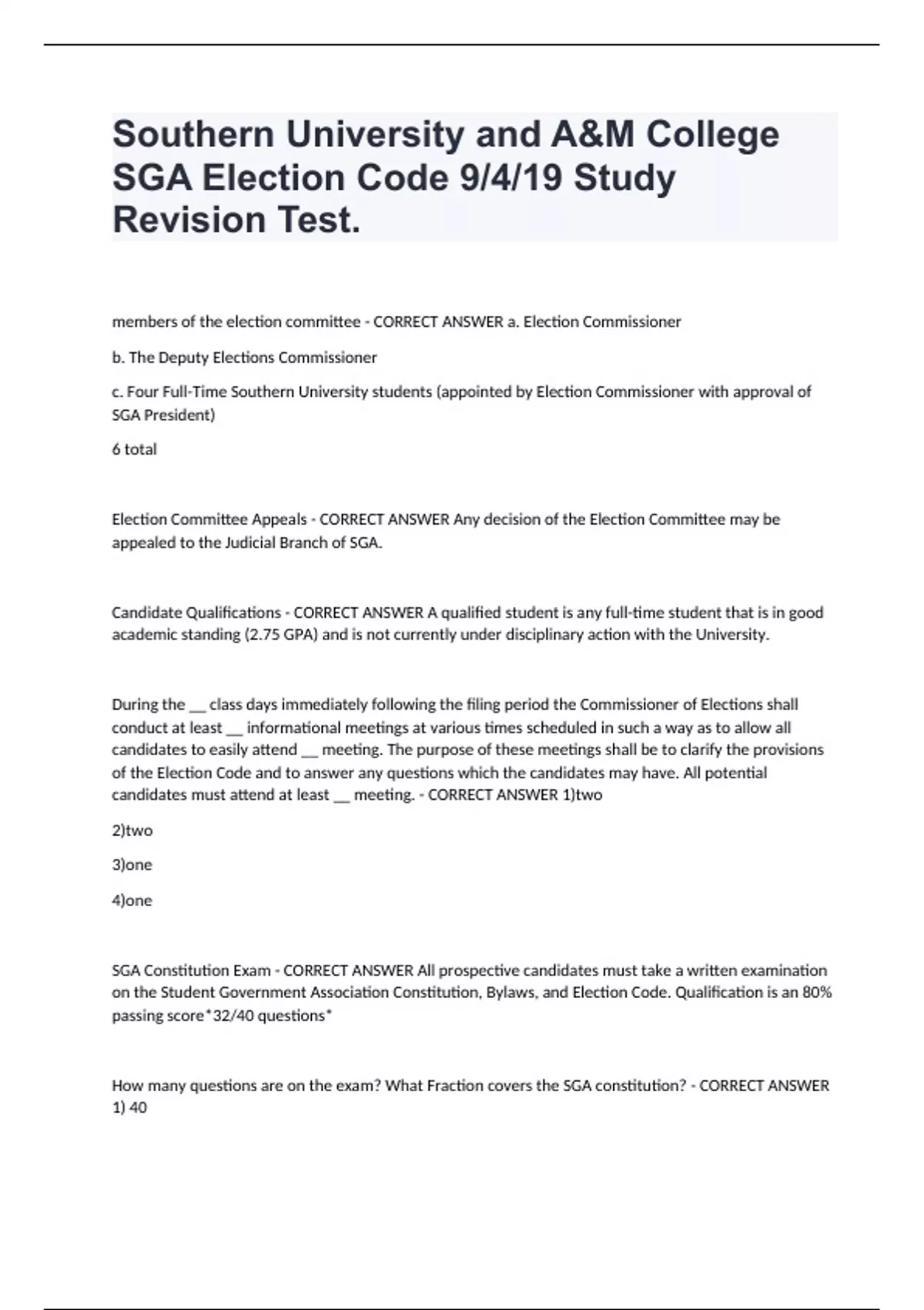 Southern University and A&M College SGA Election Code 9/4/19 Study Revision Test. members of the election committee - CORRECT ANSWER a. Election Commissioner b. The Deputy Elections Commissioner c. Four Full-Time Southern University students (appointed by Election Commissioner with approval of SGA President) 6 total Election Committee Appeals - CORRECT ANSWER Any decision of the Election Committee may be appealed to the Judicial Branch of SGA. Candidate Qualifications - CORRECT ANSWER A qualified student is any full-time student that is in good academic standing (2.75 GPA) and is not currently under disciplinary action with the University. During the __ class days immediately following the filing period the Commissioner of Elections shall conduct at least __ informational meetings at various times scheduled in such a way as to allow all candidates to easily attend __ meeting. The purpose of these meetings shall be to clarify the provisions of the Election Code and to answer any questions which the candidates may have. All potential candidates must attend at least __ meeting. - CORRECT ANSWER 1)two 2)two 3)one 4)one