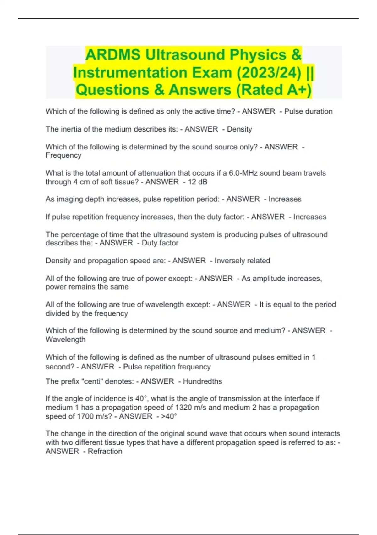 ARDMS Ultrasound Physics & Instrumentation Exam (2023/24) || Questions & Answers (Rated A+) ARDMS Ultrasound Physics & Instrumentation Exam (2023/24) || Questions & Answers (Rated A+) Which of the following is defined as only the active time? - ANSWER - Pulse duration The inertia of the medium describes its: - ANSWER - Density Which of the following is determined by the sound source only? - ANSWER - Frequency What is the total amount of attenuation that occurs if a 6.0-MHz sound beam travels through 4 cm of soft tissue? - ANSWER - 12 dB As imaging depth increases, pulse repetition period: - ANSWER - Increases If pulse repetition frequency increases, then the duty factor: - ANSWER - Increases The percentage of time that the ultrasound system is producing pulses of ultrasound describes the: - ANSWER - Duty factor Density and propagation speed are: - ANSWER - Inversely related All of the following are true of power except: - ANSWER - As amplitude increases, power remains the same All of the following are true of wavelength except: - ANSWER - It is equal to the period divided by the frequency Which of the following is determined by the sound source and medium? - ANSWER - Wavelength Which of the following is defined as the number of ultrasound pulses emitted in 1 second? - ANSWER - Pulse repetition frequency The prefix "centi" denotes: - ANSWER - Hundredths If the angle of incidence is 40°, what is the angle of transmission at the interface if medium 1 has a propagation speed of 1320 m/s and medium 2 has a propagation speed of 1700 m/s? - ANSWER - >40° The change in the direction of the original sound wave that occurs when sound interacts with two different tissue types that have a different propagation speed is referred to as: - ANSWER - Refraction Refraction is the change in direction of the transmitted sound beam that occurs with oblique incidence and dissimilar propagation speeds. Which of the following is an appropriate unit of measurement for propagation speed?