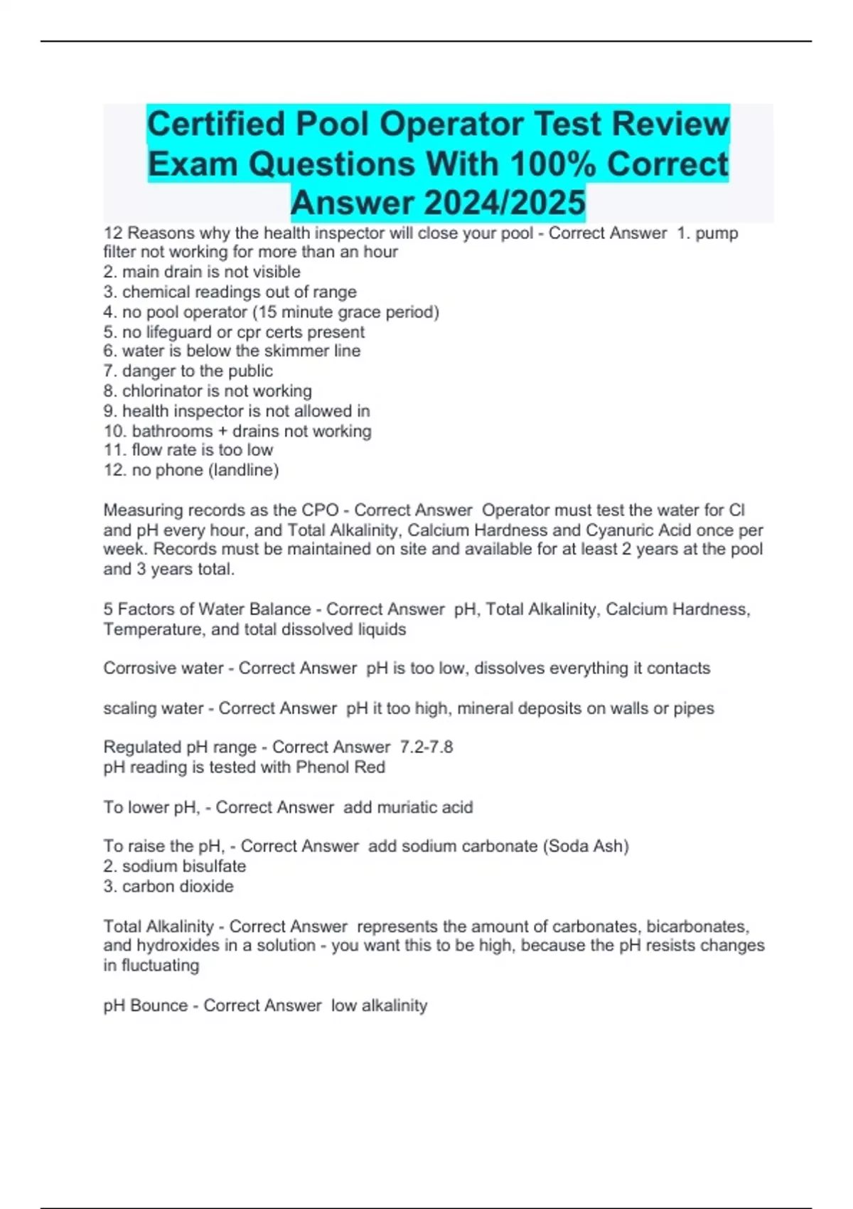 Certified Pool Operator Test Review Exam Questions With 100% Correct Answer 2024/2025 12 Reasons why the health inspector will close your pool - Correct Answer 1. pump filter not working for more than an hour 2. main drain is not visible 3. chemical readings out of range 4. no pool operator (15 minute grace period) 5. no lifeguard or cpr certs present 6. water is below the skimmer line 7. danger to the public 8. chlorinator is not working 9. health inspector is not allowed in 10. bathrooms + drains not working 11. flow rate is too low 12. no phone (landline) Measuring records as the CPO - Correct Answer Operator must test the water for Cl and pH every hour, and Total Alkalinity, Calcium Hardness and Cyanuric Acid once per week. Records must be maintained on site and available for at least 2 years at the pool and 3 years total. 5 Factors of Water Balance - Correct Answer pH, Total Alkalinity, Calcium Hardness, Temperature, and total dissolved liquids Corrosive water - Correct Answer pH is too low, dissolves everything it contacts scaling water - Correct Answer pH it too high, mineral deposits on walls or pipes Regulated pH range - Correct Answer 7.2-7.8 pH reading is tested with Phenol Red To lower pH, - Correct Answer add muriatic acid To raise the pH, - Correct Answer add sodium carbonate (Soda Ash) 2. sodium bisulfate 3. carbon dioxide