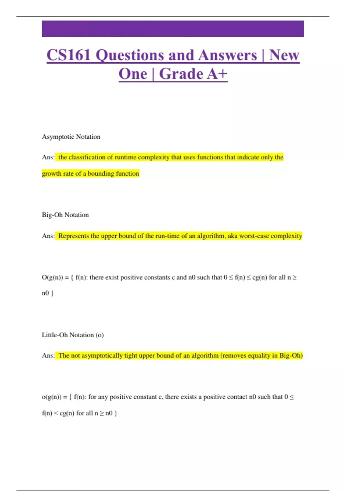 CS161 Questions and Answers | New One | Grade A+