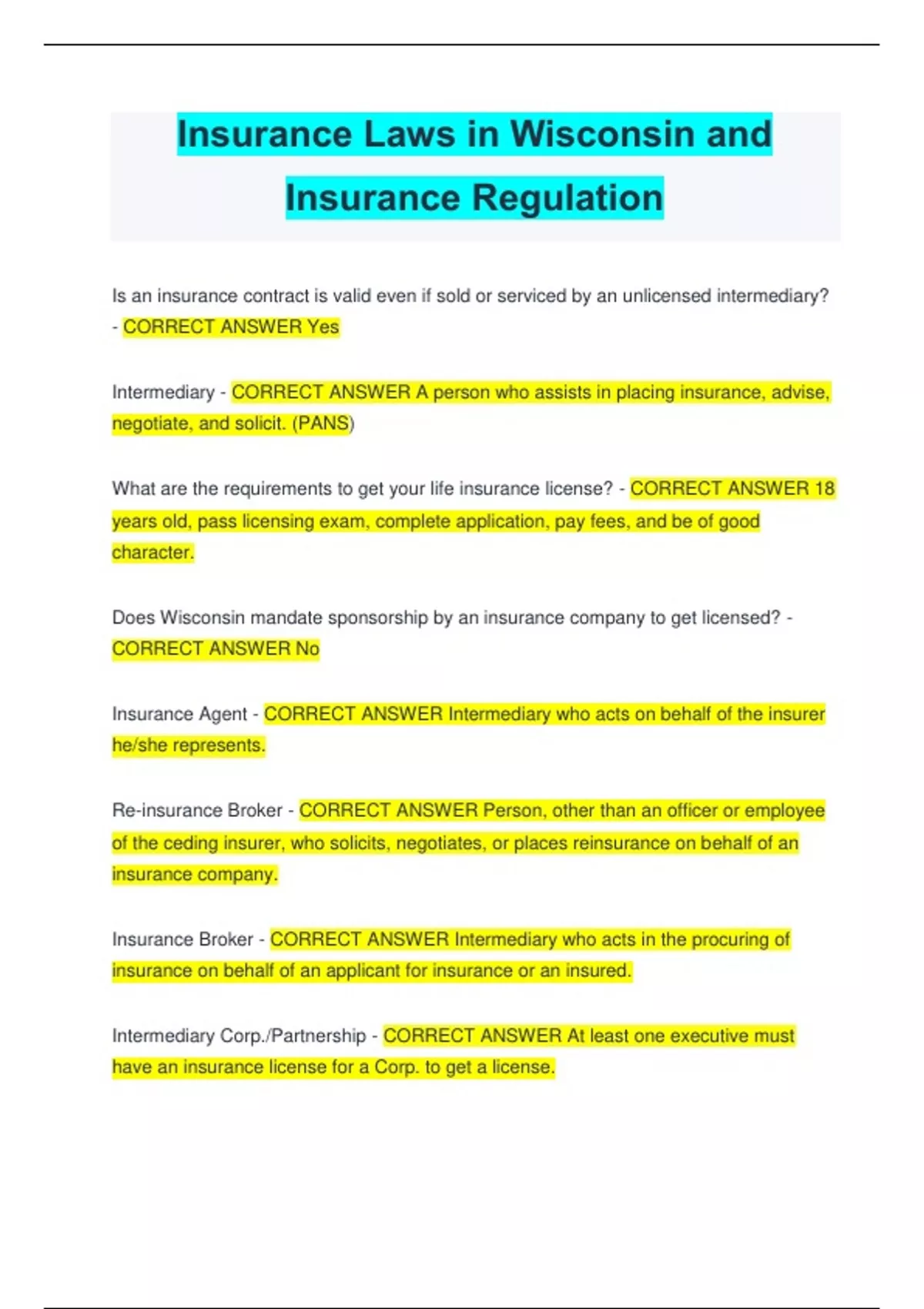 Bundle for Wisconsin Accident and Health Insurance Exam||Complete Package with 100% Verified Answers.
