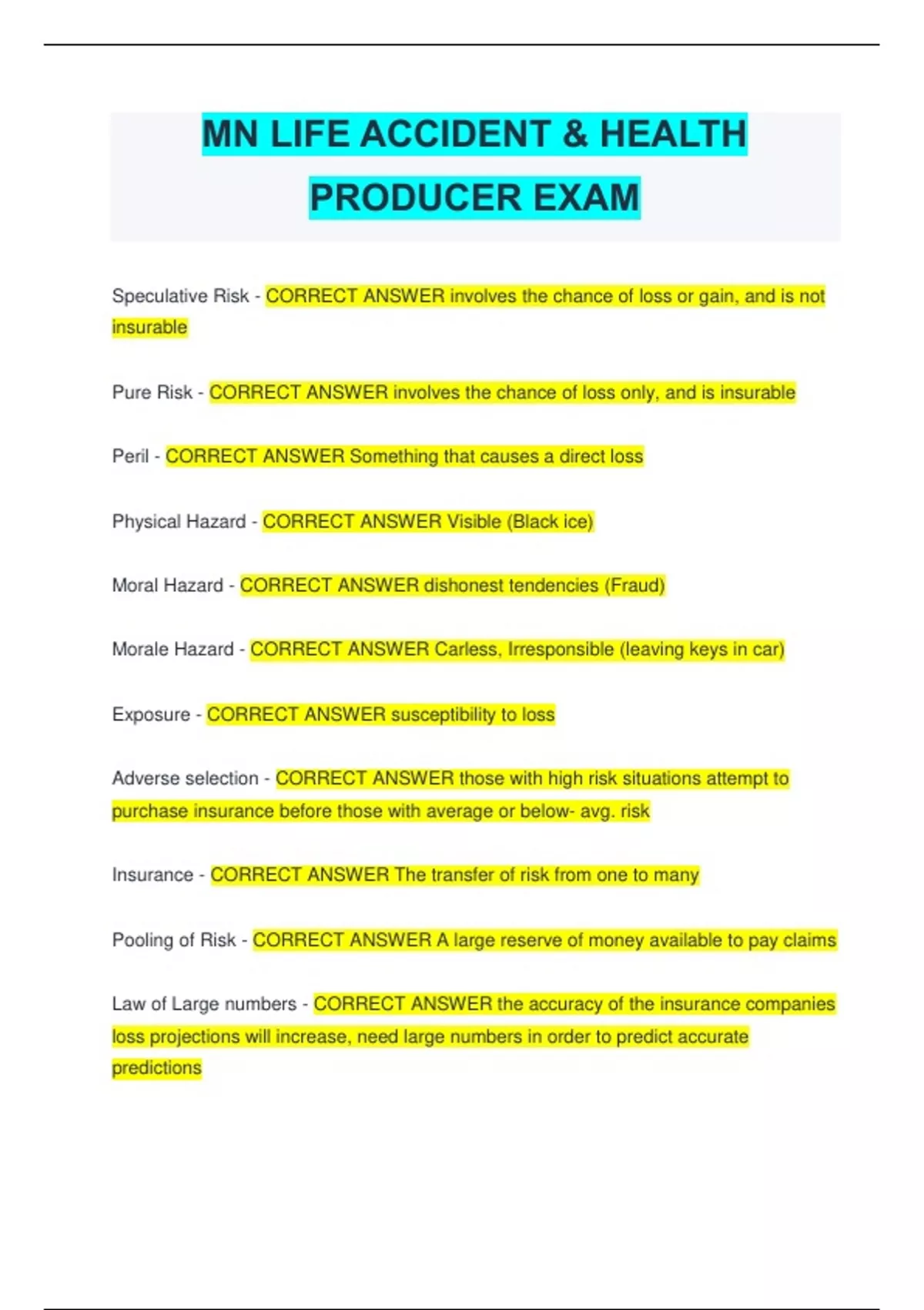 MN LIFE ACCIDENT & HEALTH PRODUCER EXAM