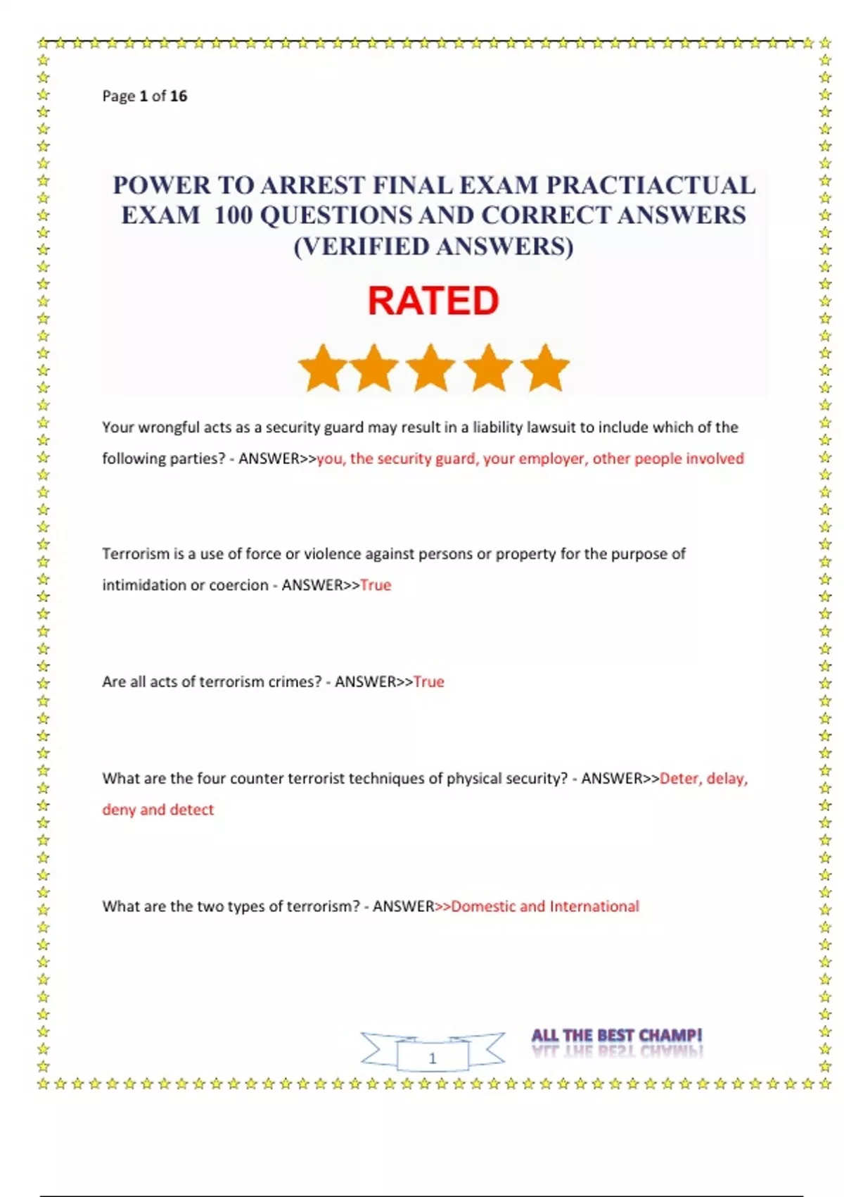 POWER TO ARREST FINAL EXAM PRACTICE AND ACTUAL EXAM 100 QUESTIONS AND CORRECT ANSWERS (VERIFIED ANSWERS)