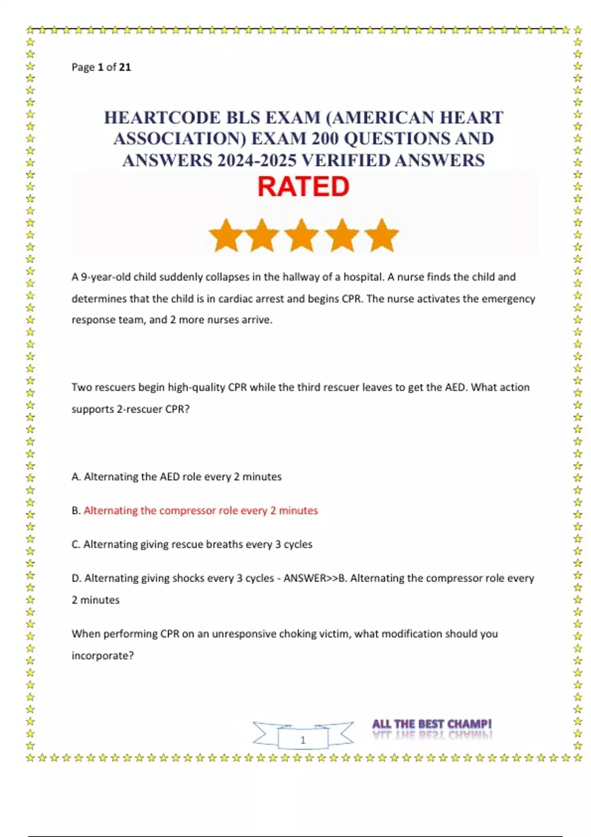 HEARTCODE BLS EXAM (AMERICAN HEART ASSOCIATION) EXAM 200 QUESTIONS AND ANSWERS VERIFIED ANSWERS