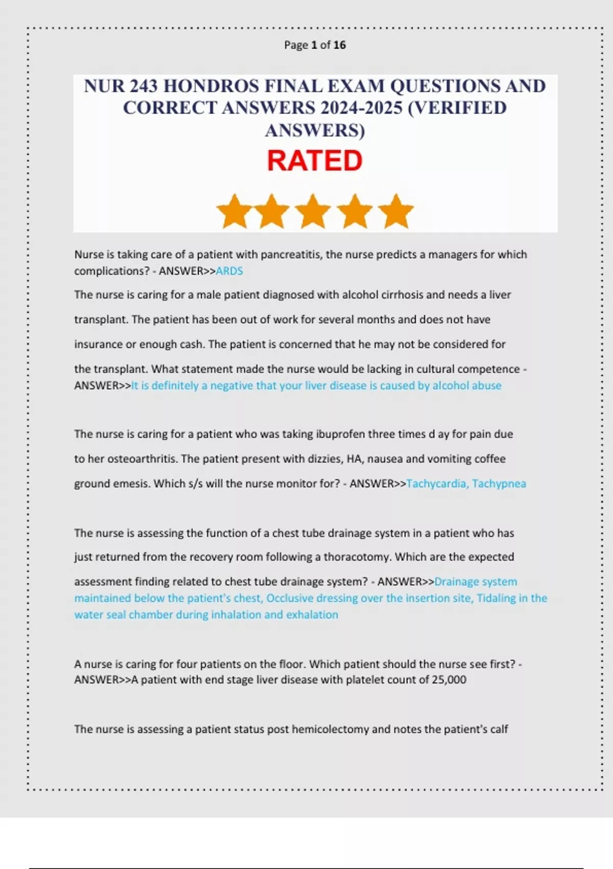 NUR 243 HONDROS FINAL EXAM QUESTIONS AND CORRECT ANSWERS (VERIFIED ANSWERS)